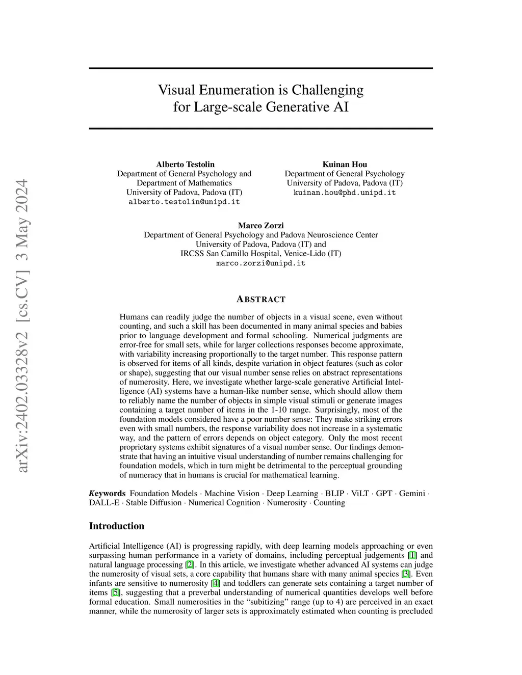 Many animal species can approximately judge the number of objects in a visual scene at a single glance, and humans can further determine the exact cardinality of a set by deploying systematic counting procedures. In contrast, it has been observed that even state-of-the-art AI systems have very limited enumeration skills. In this work, we propose two benchmark tasks inspired by cognitive science that allow to precisely evaluate the visual enumeration capabilities of multimodal foundation models, thereby providing an objective measure of their number sense and counting level. We consider popular visual question answering models (BLIP, LLaVA and ViLT) as well as advanced image-to-text (Gemini, GPT and Qwen) and text-to-image (DALL-E, FLUX and Stable Diffusion) AI systems. Our analyses show that even the most advanced models cannot reliably name the number of objects in simple visual stimuli or generate images containing a target number of items, as indexed by their low accuracy in both types of tasks. Especially for numbers outside the subitizing range, their responses are often far from the target numerosity, and, in stark contrast with human behavior, in many cases the distribution of errors depends on the object category. We also observe some striking mistakes with small numbers. Our findings demonstrate that developing an intuitive visual understanding of number remains challenging for AI models and that merely increasing model size might not be a viable strategy to promote the emergence of systematic counting skills. We release the full code of our benchmark to facilitate the evaluation of enumeration skills in future AI systems.