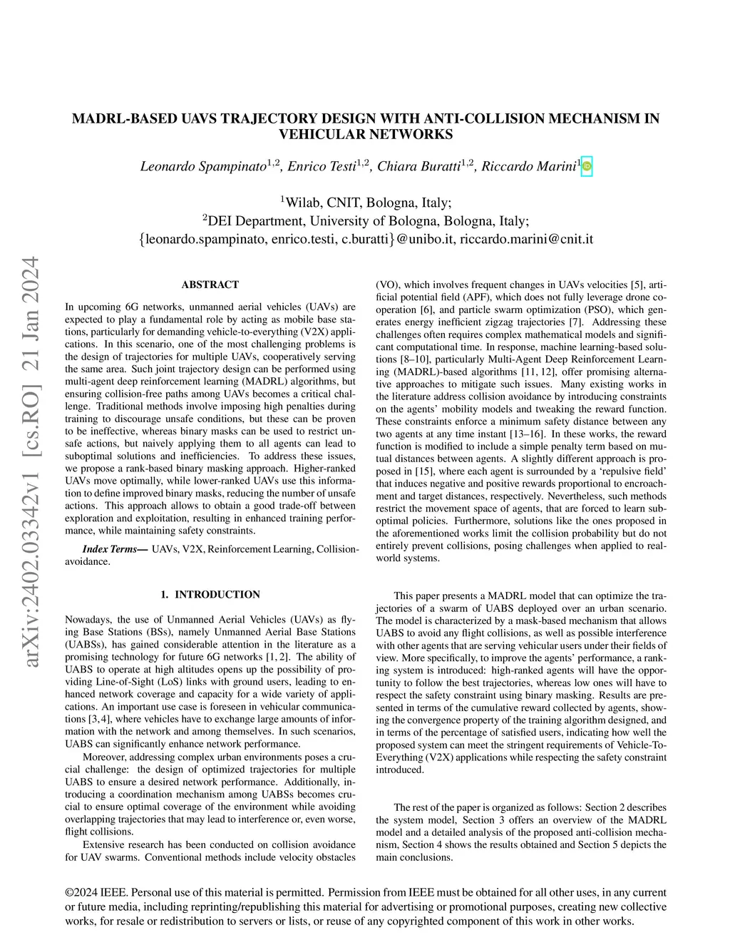 In upcoming 6G networks, unmanned aerial vehicles (UAVs) are expected to play a fundamental role by acting as mobile base stations, particularly for demanding vehicle-to-everything (V2X) applications. In this scenario, one of the most challenging problems is the design of trajectories for multiple UAVs, cooperatively serving the same area. Such joint trajectory design can be performed using multi-agent deep reinforcement learning (MADRL) algorithms, but ensuring collision-free paths among UAVs becomes a critical challenge. Traditional methods involve imposing high penalties during training to discourage unsafe conditions, but these can be proven to be ineffective, whereas binary masks can be used to restrict unsafe actions, but naively applying them to all agents can lead to suboptimal solutions and inefficiencies. To address these issues, we propose a rank-based binary masking approach. Higher-ranked UAVs move optimally, while lower-ranked UAVs use this information to define improved binary masks, reducing the number of unsafe actions. This approach allows to obtain a good trade-off between exploration and exploitation, resulting in enhanced training performance, while maintaining safety constraints.