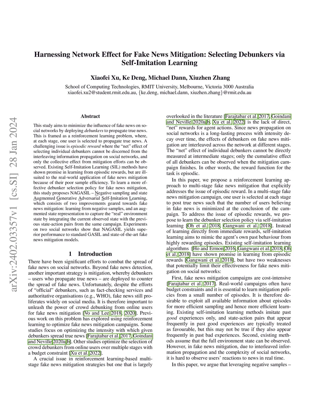 This study aims to minimize the influence of fake news on social networks by deploying debunkers to propagate true news. This is framed as a reinforcement learning problem, where, at each stage, one user is selected to propagate true news. A challenging issue is episodic reward where the "net" effect of selecting individual debunkers cannot be discerned from the interleaving information propagation on social networks, and only the collective effect from mitigation efforts can be observed. Existing Self-Imitation Learning (SIL) methods have shown promise in learning from episodic rewards, but are ill-suited to the real-world application of fake news mitigation because of their poor sample efficiency. To learn a more effective debunker selection policy for fake news mitigation, this study proposes NAGASIL - Negative sampling and state Augmented Generative Adversarial Self-Imitation Learning, which consists of two improvements geared towards fake news mitigation: learning from negative samples, and an augmented state representation to capture the "real" environment state by integrating the current observed state with the previous state-action pairs from the same campaign. Experiments on two social networks show that NAGASIL yields superior performance to standard GASIL and state-of-the-art fake news mitigation models.