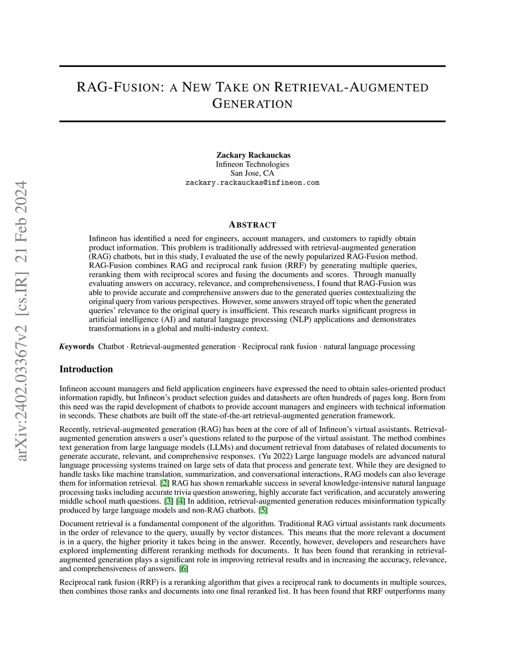 Infineon has identified a need for engineers, account managers, and customers to rapidly obtain product information. This problem is traditionally addressed with retrieval-augmented generation (RAG) chatbots, but in this study, I evaluated the use of the newly popularized RAG-Fusion method. RAG-Fusion combines RAG and reciprocal rank fusion (RRF) by generating multiple queries, reranking them with reciprocal scores and fusing the documents and scores. Through manually evaluating answers on accuracy, relevance, and comprehensiveness, I found that RAG-Fusion was able to provide accurate and comprehensive answers due to the generated queries contextualizing the original query from various perspectives. However, some answers strayed off topic when the generated queries' relevance to the original query is insufficient. This research marks significant progress in artificial intelligence (AI) and natural language processing (NLP) applications and demonstrates transformations in a global and multi-industry context.