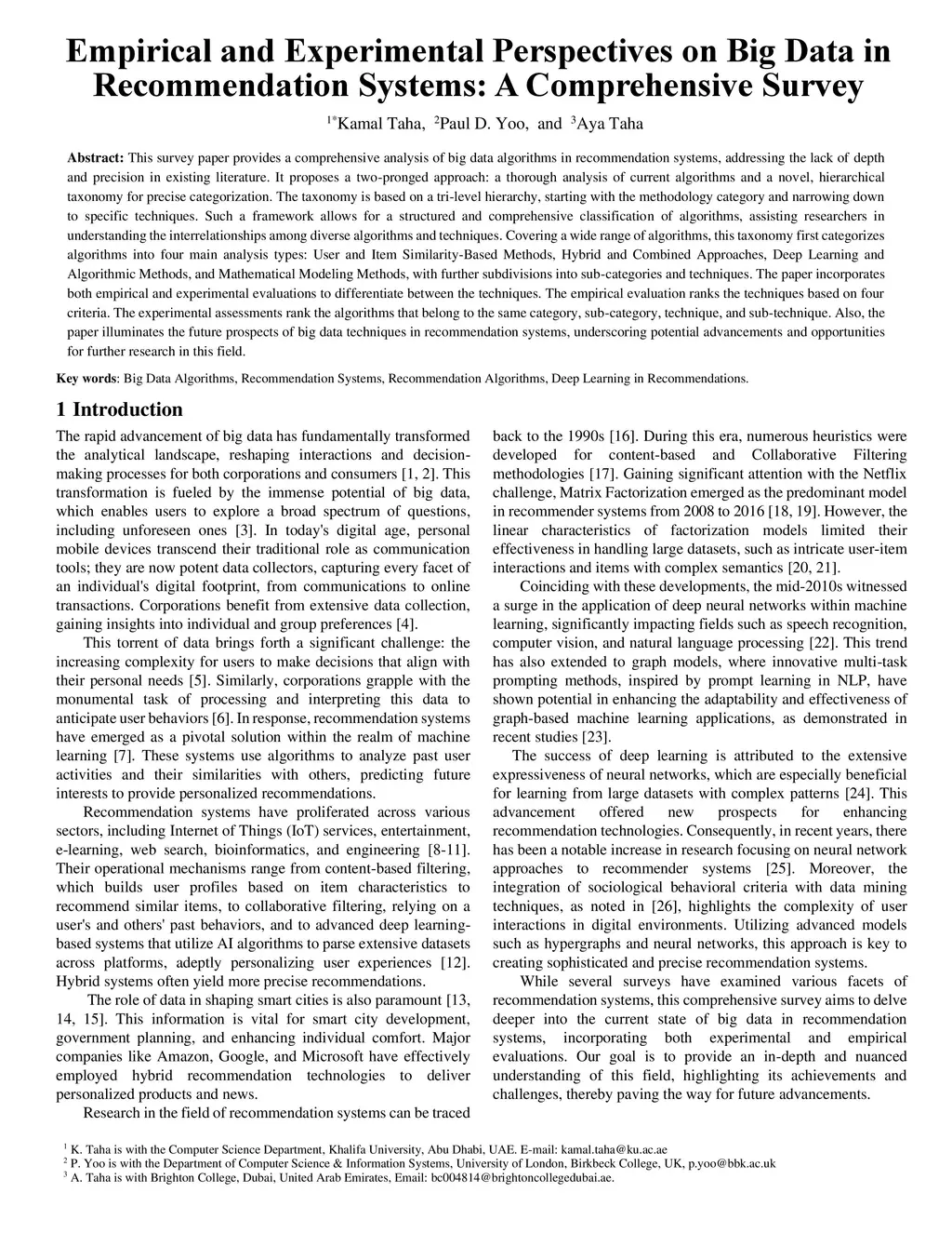 This survey paper provides a comprehensive analysis of big data algorithms in recommendation systems, addressing the lack of depth and precision in existing literature. It proposes a two-pronged approach: a thorough analysis of current algorithms and a novel, hierarchical taxonomy for precise categorization. The taxonomy is based on a tri-level hierarchy, starting with the methodology category and narrowing down to specific techniques. Such a framework allows for a structured and comprehensive classification of algorithms, assisting researchers in understanding the interrelationships among diverse algorithms and techniques. Covering a wide range of algorithms, this taxonomy first categorizes algorithms into four main analysis types: User and Item Similarity-Based Methods, Hybrid and Combined Approaches, Deep Learning and Algorithmic Methods, and Mathematical Modeling Methods, with further subdivisions into sub-categories and techniques. The paper incorporates both empirical and experimental evaluations to differentiate between the techniques. The empirical evaluation ranks the techniques based on four criteria. The experimental assessments rank the algorithms that belong to the same category, sub-category, technique, and sub-technique. Also, the paper illuminates the future prospects of big data techniques in recommendation systems, underscoring potential advancements and opportunities for further research in this field