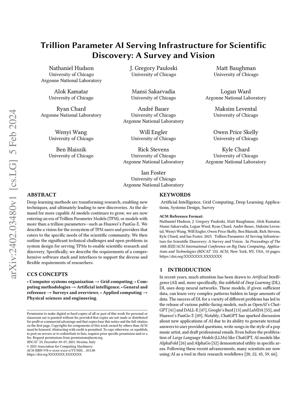 Deep learning methods are transforming research, enabling new techniques, and ultimately leading to new discoveries. As the demand for more capable AI models continues to grow, we are now entering an era of Trillion Parameter Models (TPM), or models with more than a trillion parameters -- such as Huawei's PanGu-. We describe a vision for the ecosystem of TPM users and providers that caters to the specific needs of the scientific community. We then outline the significant technical challenges and open problems in system design for serving TPMs to enable scientific research and discovery. Specifically, we describe the requirements of a comprehensive software stack and interfaces to support the diverse and flexible requirements of researchers.