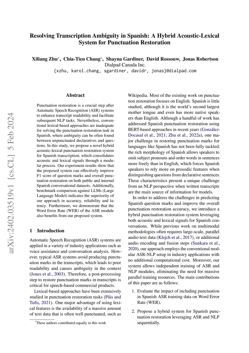 Punctuation restoration is a crucial step after Automatic Speech Recognition (ASR) systems to enhance transcript readability and facilitate subsequent NLP tasks. Nevertheless, conventional lexical-based approaches are inadequate for solving the punctuation restoration task in Spanish, where ambiguity can be often found between unpunctuated declaratives and questions. In this study, we propose a novel hybrid acoustic-lexical punctuation restoration system for Spanish transcription, which consolidates acoustic and lexical signals through a modular process. Our experiment results show that the proposed system can effectively improve F1 score of question marks and overall punctuation restoration on both public and internal Spanish conversational datasets. Additionally, benchmark comparison against LLMs (Large Language Model) indicates the superiority of our approach in accuracy, reliability and latency. Furthermore, we demonstrate that the Word Error Rate (WER) of the ASR module also benefits from our proposed system.
