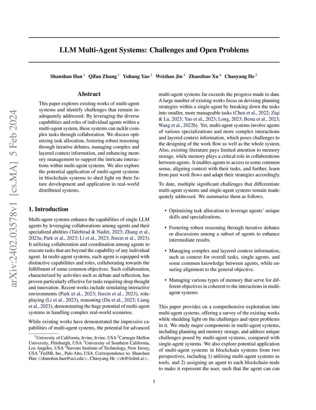 This paper explores multi-agent systems and identify challenges that remain inadequately addressed. By leveraging the diverse capabilities and roles of individual agents, multi-agent systems can tackle complex tasks through agent collaboration. We discuss optimizing task allocation, fostering robust reasoning through iterative debates, managing complex and layered context information, and enhancing memory management to support the intricate interactions within multi-agent systems. We also explore potential applications of multi-agent systems in blockchain systems to shed light on their future development and application in real-world distributed systems.