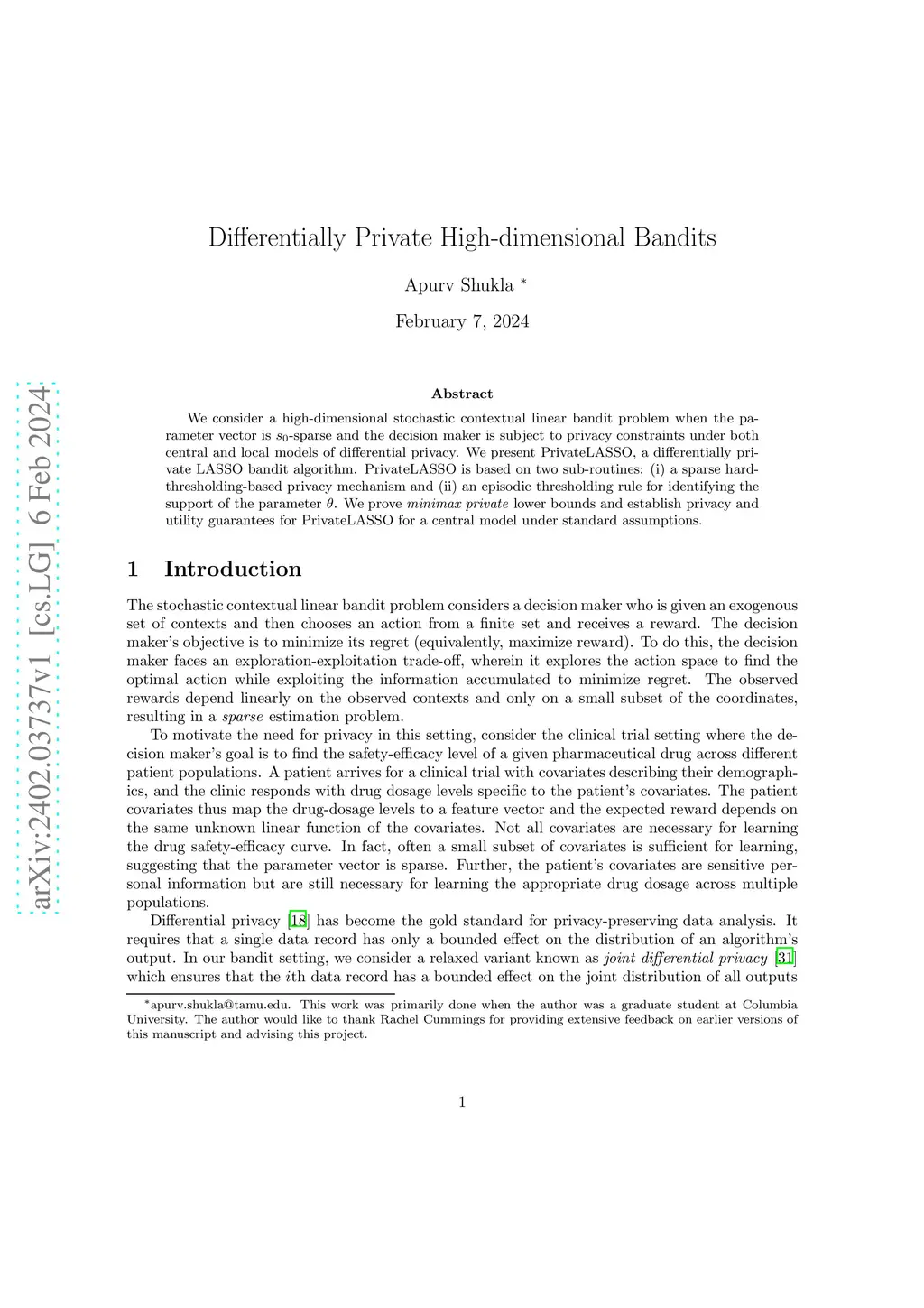 We consider a high-dimensional stochastic contextual linear bandit problem when the parameter vector is -sparse and the decision maker is subject to privacy constraints under both central and local models of differential privacy. We present PrivateLASSO, a differentially private LASSO bandit algorithm. PrivateLASSO is based on two sub-routines: (i) a sparse hard-thresholding-based privacy mechanism and (ii) an episodic thresholding rule for identifying the support of the parameter . We prove minimax private lower bounds and establish privacy and utility guarantees for PrivateLASSO for the central model under standard assumptions.