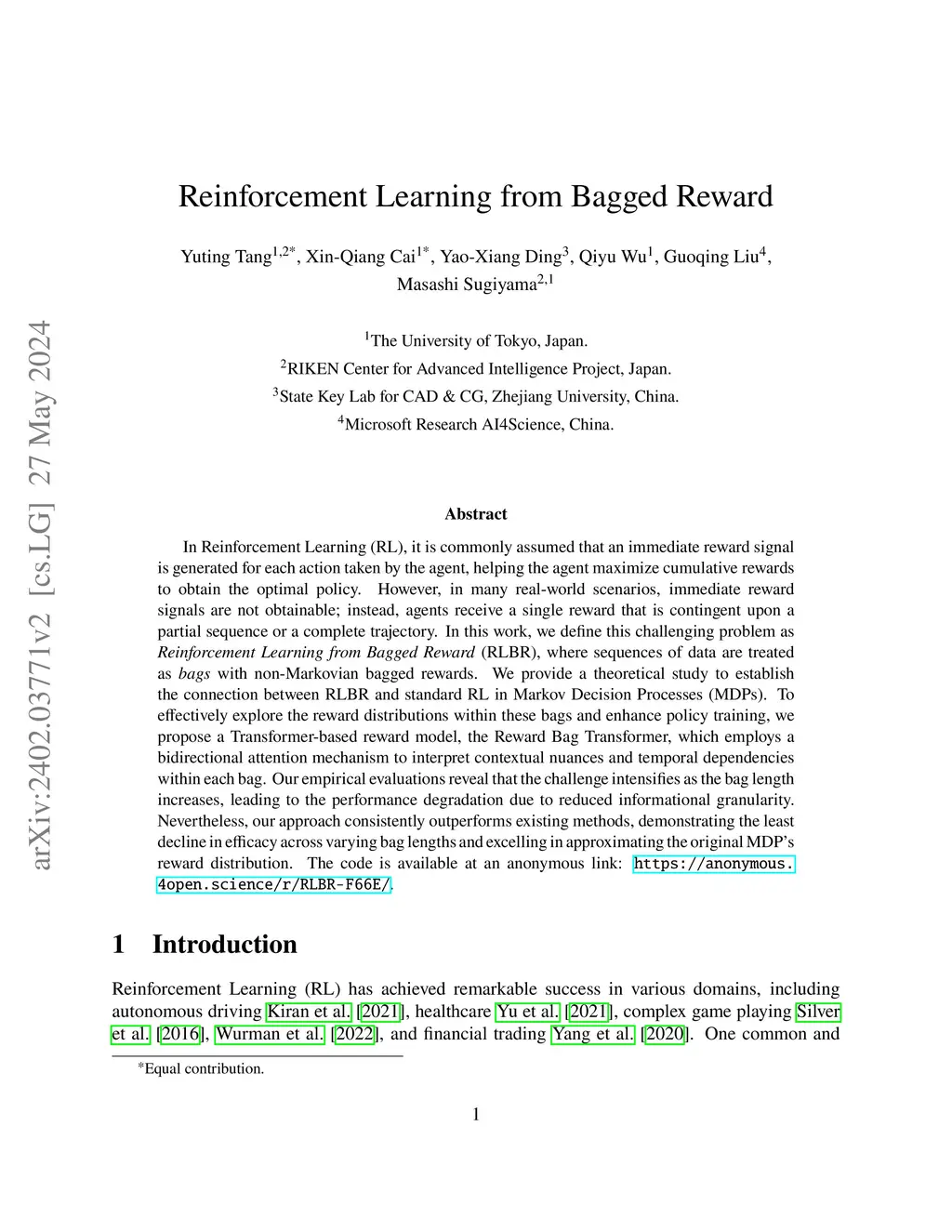 In Reinforcement Learning (RL), it is commonly assumed that an immediate reward signal is generated for each action taken by the agent, helping the agent maximize cumulative rewards to obtain the optimal policy. However, in many real-world scenarios, immediate reward signals are not obtainable; instead, agents receive a single reward that is contingent upon a partial sequence or a complete trajectory. In this work, we define this challenging problem as Reinforcement Learning from Bagged Reward (RLBR), where sequences of data are treated as bags with non-Markovian bagged rewards. We provide a theoretical study to establish the connection between RLBR and standard RL in Markov Decision Processes (MDPs). To effectively explore the reward distributions within these bags and enhance policy training, we propose a Transformer-based reward model, the Reward Bag Transformer, which employs a bidirectional attention mechanism to interpret contextual nuances and temporal dependencies within each bag. Our empirical evaluations reveal that the challenge intensifies as the bag length increases, leading to the performance degradation due to reduced informational granularity. Nevertheless, our approach consistently outperforms existing methods, demonstrating the least decline in efficacy across varying bag lengths and excelling in approximating the original MDP's reward distribution.