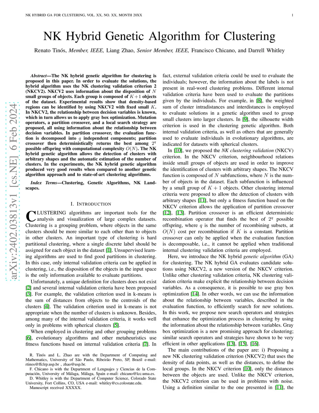 The NK hybrid genetic algorithm for clustering is proposed in this paper. In order to evaluate the solutions, the hybrid algorithm uses the NK clustering validation criterion 2 (NKCV2). NKCV2 uses information about the disposition of small groups of objects. Each group is composed of objects of the dataset. Experimental results show that density-based regions can be identified by using NKCV2 with fixed small . In NKCV2, the relationship between decision variables is known, which in turn allows us to apply gray box optimization. Mutation operators, a partition crossover, and a local search strategy are proposed, all using information about the relationship between decision variables. In partition crossover, the evaluation function is decomposed into independent components; partition crossover then deterministically returns the best among possible offspring with computational complexity . The NK hybrid genetic algorithm allows the detection of clusters with arbitrary shapes and the automatic estimation of the number of clusters. In the experiments, the NK hybrid genetic algorithm produced very good results when compared to another genetic algorithm approach and to state-of-art clustering algorithms.