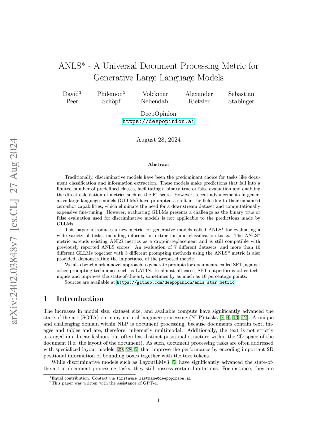 Traditionally, discriminative models have been the predominant choice for tasks like document classification and information extraction. These models make predictions that fall into a limited number of predefined classes, facilitating a binary true or false evaluation and enabling the direct calculation of metrics such as the F1 score. However, recent advancements in generative large language models (GLLMs) have prompted a shift in the field due to their enhanced zero-shot capabilities, which eliminate the need for a downstream dataset and computationally expensive fine-tuning. However, evaluating GLLMs presents a challenge as the binary true or false evaluation used for discriminative models is not applicable to the predictions made by GLLMs. This paper introduces a new metric for generative models called ANLS* for evaluating a wide variety of tasks, including information extraction and classification tasks. The ANLS* metric extends existing ANLS metrics as a drop-in-replacement and is still compatible with previously reported ANLS scores. An evaluation of 7 different datasets, and more than 10 different GLLMs together with 3 different prompting methods using the ANLS* metric is also provided, demonstrating the importance of the proposed metric. We also benchmark a novel approach to generate prompts for documents, called SFT, against other prompting techniques such as LATIN. In 6 out of 7 cases, SFT outperforms other techniques and improves the state-of-the-art, sometimes by as much as percentage points. Sources are available at https://github.com/deepopinion/anls_star_metric