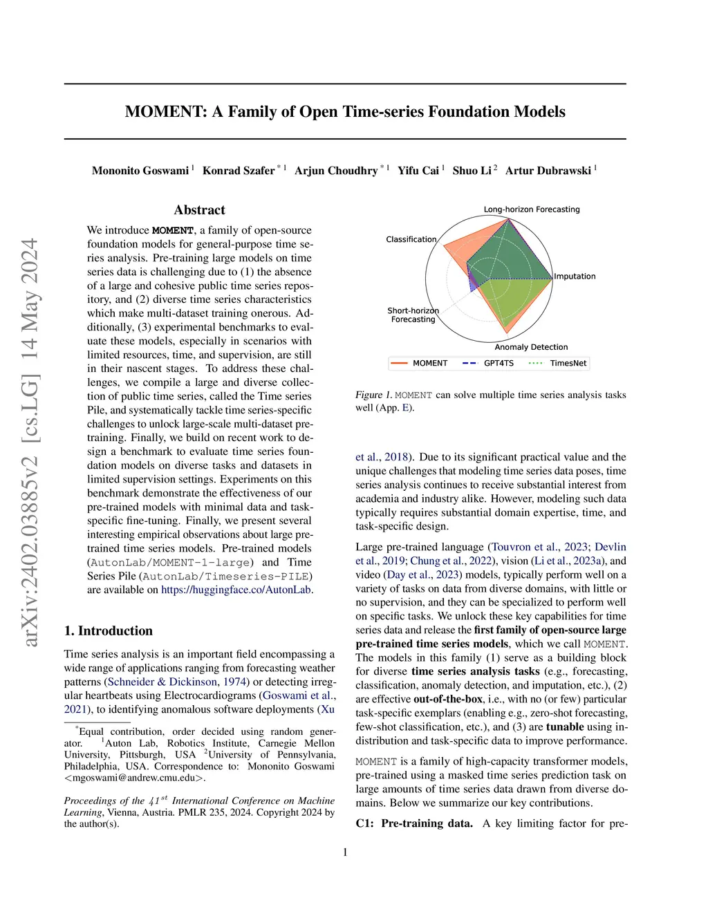 We introduce MOMENT, a family of open-source foundation models for general-purpose time series analysis. Pre-training large models on time series data is challenging due to (1) the absence of a large and cohesive public time series repository, and (2) diverse time series characteristics which make multi-dataset training onerous. Additionally, (3) experimental benchmarks to evaluate these models, especially in scenarios with limited resources, time, and supervision, are still in their nascent stages. To address these challenges, we compile a large and diverse collection of public time series, called the Time series Pile, and systematically tackle time series-specific challenges to unlock large-scale multi-dataset pre-training. Finally, we build on recent work to design a benchmark to evaluate time series foundation models on diverse tasks and datasets in limited supervision settings. Experiments on this benchmark demonstrate the effectiveness of our pre-trained models with minimal data and task-specific fine-tuning. Finally, we present several interesting empirical observations about large pre-trained time series models. Pre-trained models (AutonLab/MOMENT-1-large) and Time Series Pile (AutonLab/Timeseries-PILE) are available on Huggingface.