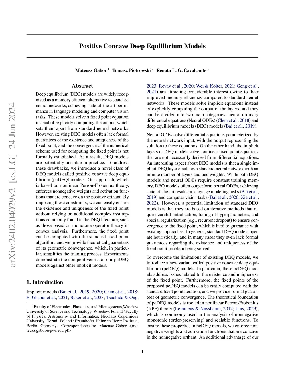Deep equilibrium (DEQ) models are widely recognized as a memory efficient alternative to standard neural networks, achieving state-of-the-art performance in language modeling and computer vision tasks. These models solve a fixed point equation instead of explicitly computing the output, which sets them apart from standard neural networks. However, existing DEQ models often lack formal guarantees of the existence and uniqueness of the fixed point, and the convergence of the numerical scheme used for computing the fixed point is not formally established. As a result, DEQ models are potentially unstable in practice. To address these drawbacks, we introduce a novel class of DEQ models called positive concave deep equilibrium (pcDEQ) models. Our approach, which is based on nonlinear Perron-Frobenius theory, enforces nonnegative weights and activation functions that are concave on the positive orthant. By imposing these constraints, we can easily ensure the existence and uniqueness of the fixed point without relying on additional complex assumptions commonly found in the DEQ literature, such as those based on monotone operator theory in convex analysis. Furthermore, the fixed point can be computed with the standard fixed point algorithm, and we provide theoretical guarantees of its geometric convergence, which, in particular, simplifies the training process. Experiments demonstrate the competitiveness of our pcDEQ models against other implicit models.