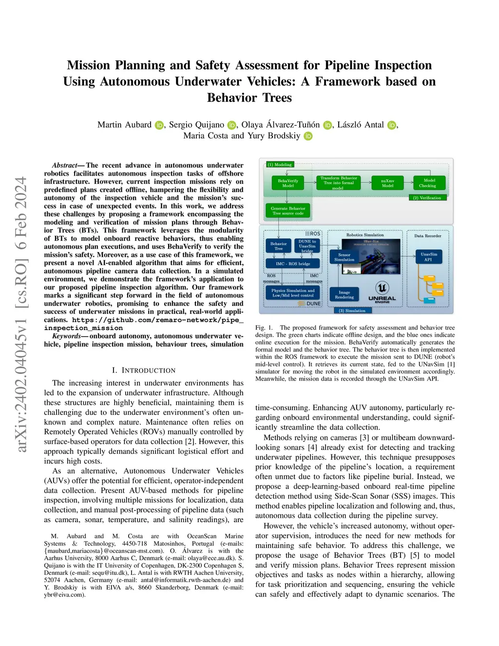 The recent advance in autonomous underwater robotics facilitates autonomous inspection tasks of offshore infrastructure. However, current inspection missions rely on predefined plans created offline, hampering the flexibility and autonomy of the inspection vehicle and the mission's success in case of unexpected events. In this work, we address these challenges by proposing a framework encompassing the modeling and verification of mission plans through Behavior Trees (BTs). This framework leverages the modularity of BTs to model onboard reactive behaviors, thus enabling autonomous plan executions, and uses BehaVerify to verify the mission's safety. Moreover, as a use case of this framework, we present a novel AI-enabled algorithm that aims for efficient, autonomous pipeline camera data collection. In a simulated environment, we demonstrate the framework's application to our proposed pipeline inspection algorithm. Our framework marks a significant step forward in the field of autonomous underwater robotics, promising to enhance the safety and success of underwater missions in practical, real-world applications. https://github.com/remaro-network/pipe_inspection_mission