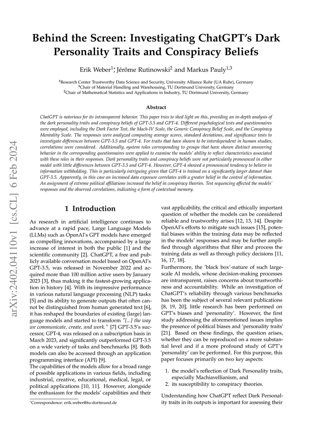 ChatGPT is notorious for its intransparent behavior. This paper tries to shed light on this, providing an in-depth analysis of the dark personality traits and conspiracy beliefs of GPT-3.5 and GPT-4. Different psychological tests and questionnaires were employed, including the Dark Factor Test, the Mach-IV Scale, the Generic Conspiracy Belief Scale, and the Conspiracy Mentality Scale. The responses were analyzed computing average scores, standard deviations, and significance tests to investigate differences between GPT-3.5 and GPT-4. For traits that have shown to be interdependent in human studies, correlations were considered. Additionally, system roles corresponding to groups that have shown distinct answering behavior in the corresponding questionnaires were applied to examine the models' ability to reflect characteristics associated with these roles in their responses. Dark personality traits and conspiracy beliefs were not particularly pronounced in either model with little differences between GPT-3.5 and GPT-4. However, GPT-4 showed a pronounced tendency to believe in information withholding. This is particularly intriguing given that GPT-4 is trained on a significantly larger dataset than GPT-3.5. Apparently, in this case an increased data exposure correlates with a greater belief in the control of information. An assignment of extreme political affiliations increased the belief in conspiracy theories. Test sequencing affected the models' responses and the observed correlations, indicating a form of contextual memory.