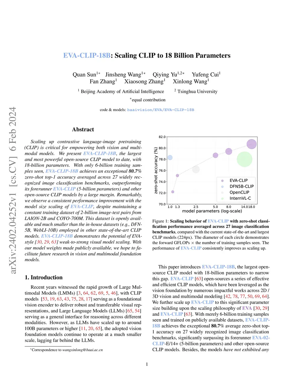 Scaling up contrastive language-image pretraining (CLIP) is critical for empowering both vision and multimodal models. We present EVA-CLIP-18B, the largest and most powerful open-source CLIP model to date, with 18-billion parameters. With only 6-billion training samples seen, EVA-CLIP-18B achieves an exceptional 80.7% zero-shot top-1 accuracy averaged across 27 widely recognized image classification benchmarks, outperforming its forerunner EVA-CLIP (5-billion parameters) and other open-source CLIP models by a large margin. Remarkably, we observe a consistent performance improvement with the model size scaling of EVA-CLIP, despite maintaining a constant training dataset of 2-billion image-text pairs from LAION-2B and COYO-700M. This dataset is openly available and much smaller than the in-house datasets (e.g., DFN-5B, WebLI-10B) employed in other state-of-the-art CLIP models. EVA-CLIP-18B demonstrates the potential of EVA-style weak-to-strong visual model scaling. With our model weights made publicly available, we hope to facilitate future research in vision and multimodal foundation models.