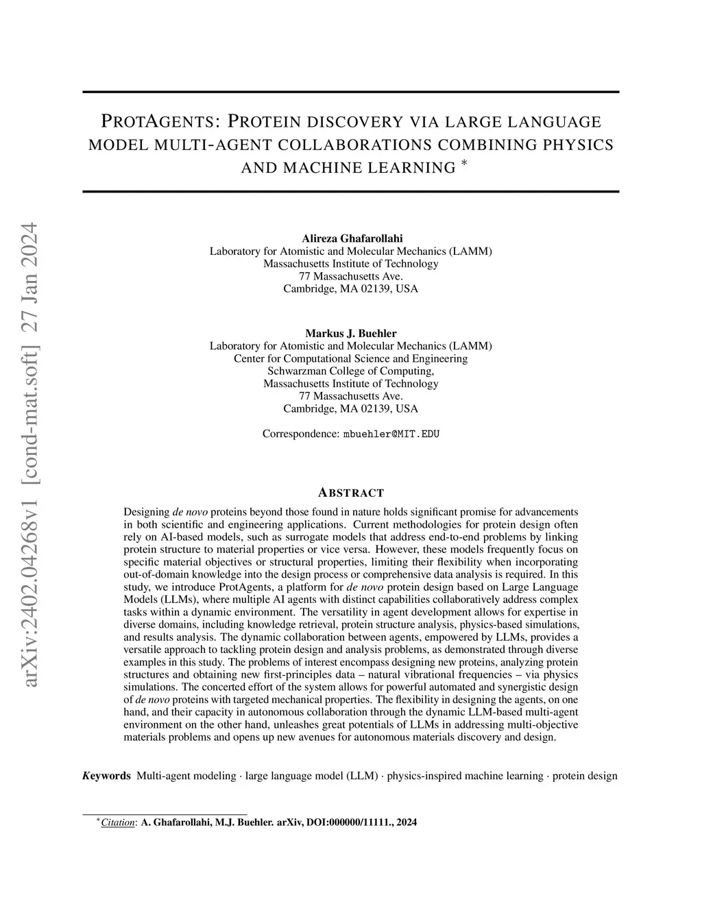 Designing de novo proteins beyond those found in nature holds significant promise for advancements in both scientific and engineering applications. Current methodologies for protein design often rely on AI-based models, such as surrogate models that address end-to-end problems by linking protein structure to material properties or vice versa. However, these models frequently focus on specific material objectives or structural properties, limiting their flexibility when incorporating out-of-domain knowledge into the design process or comprehensive data analysis is required. In this study, we introduce ProtAgents, a platform for de novo protein design based on Large Language Models (LLMs), where multiple AI agents with distinct capabilities collaboratively address complex tasks within a dynamic environment. The versatility in agent development allows for expertise in diverse domains, including knowledge retrieval, protein structure analysis, physics-based simulations, and results analysis. The dynamic collaboration between agents, empowered by LLMs, provides a versatile approach to tackling protein design and analysis problems, as demonstrated through diverse examples in this study. The problems of interest encompass designing new proteins, analyzing protein structures and obtaining new first-principles data -- natural vibrational frequencies -- via physics simulations. The concerted effort of the system allows for powerful automated and synergistic design of de novo proteins with targeted mechanical properties. The flexibility in designing the agents, on one hand, and their capacity in autonomous collaboration through the dynamic LLM-based multi-agent environment on the other hand, unleashes great potentials of LLMs in addressing multi-objective materials problems and opens up new avenues for autonomous materials discovery and design.