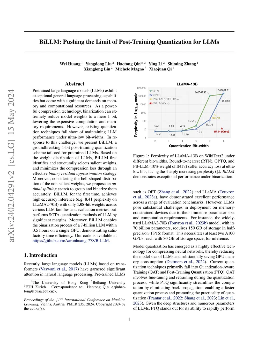 BiLLM: Pushing the Limit of Post-Training Quantization for LLMs