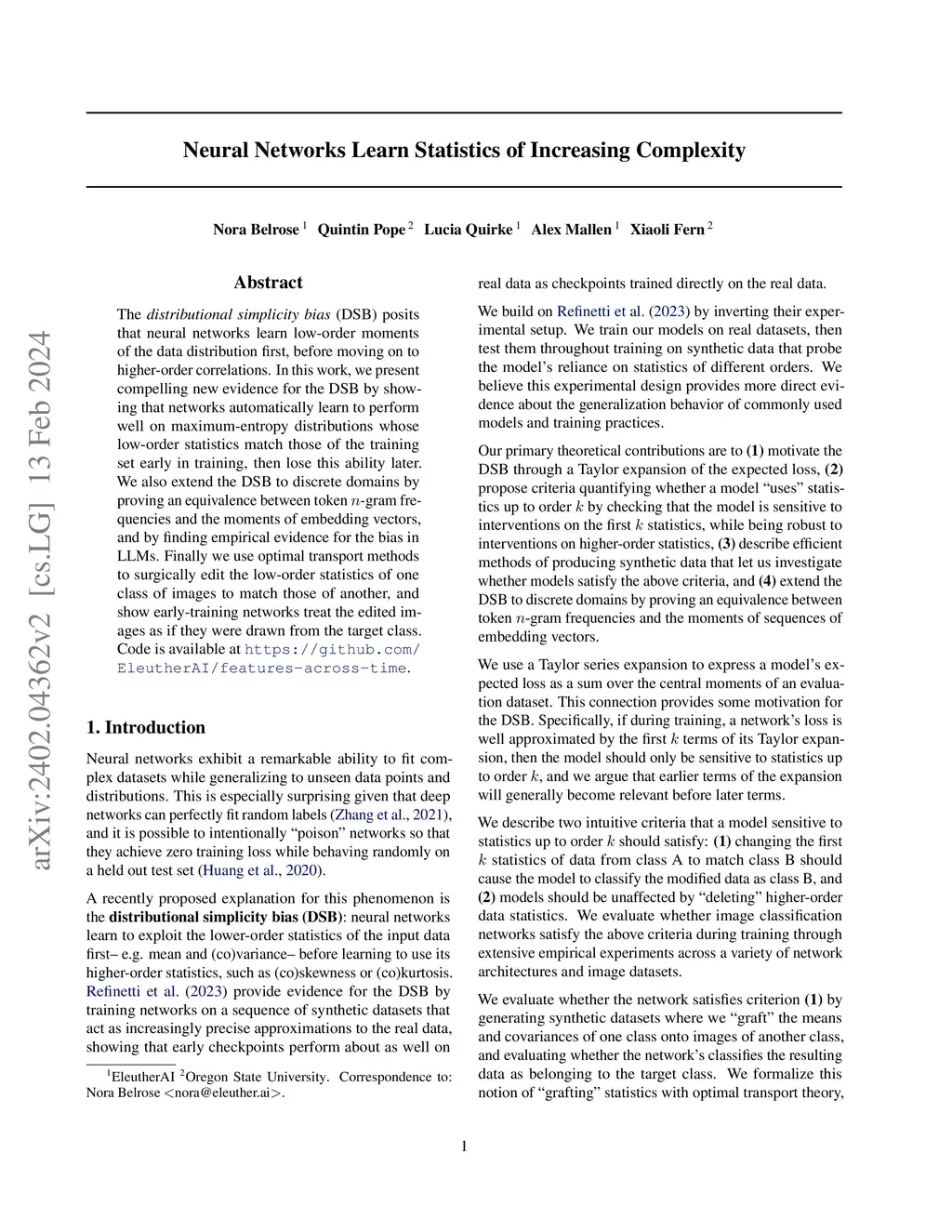 The distributional simplicity bias (DSB) posits that neural networks learn low-order moments of the data distribution first, before moving on to higher-order correlations. In this work, we present compelling new evidence for the DSB by showing that networks automatically learn to perform well on maximum-entropy distributions whose low-order statistics match those of the training set early in training, then lose this ability later. We also extend the DSB to discrete domains by proving an equivalence between token -gram frequencies and the moments of embedding vectors, and by finding empirical evidence for the bias in LLMs. Finally we use optimal transport methods to surgically edit the low-order statistics of one class to match those of another, and show that early-training networks treat the edited samples as if they were drawn from the target class. Code is available at https://github.com/EleutherAI/features-across-time.