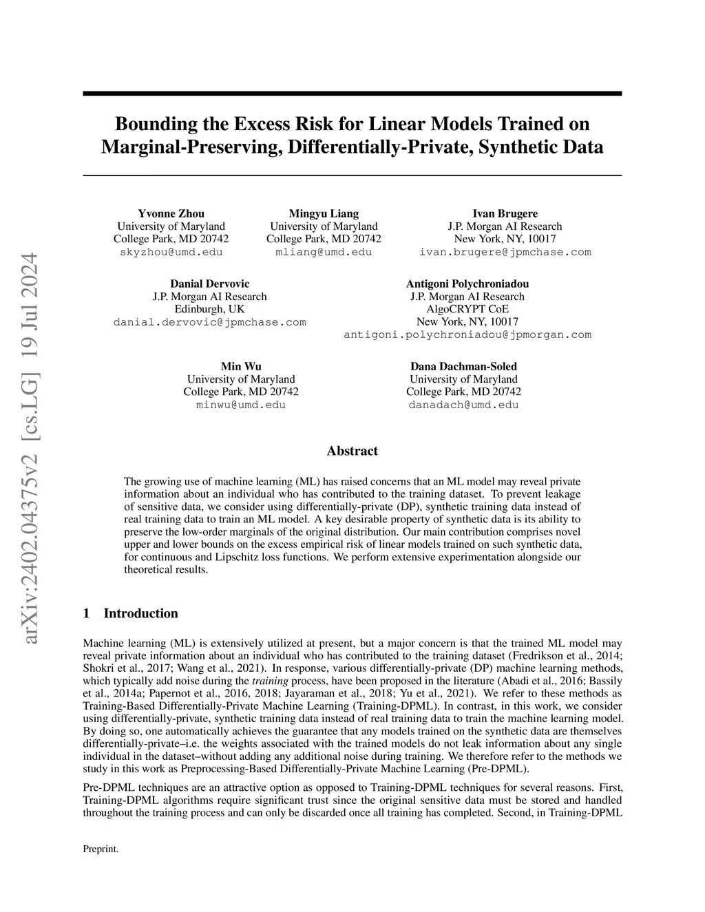 The growing use of machine learning (ML) has raised concerns that an ML model may reveal private information about an individual who has contributed to the training dataset. To prevent leakage of sensitive data, we consider using differentially-private (DP), synthetic training data instead of real training data to train an ML model. A key desirable property of synthetic data is its ability to preserve the low-order marginals of the original distribution. Our main contribution comprises novel upper and lower bounds on the excess empirical risk of linear models trained on such synthetic data, for continuous and Lipschitz loss functions. We perform extensive experimentation alongside our theoretical results.