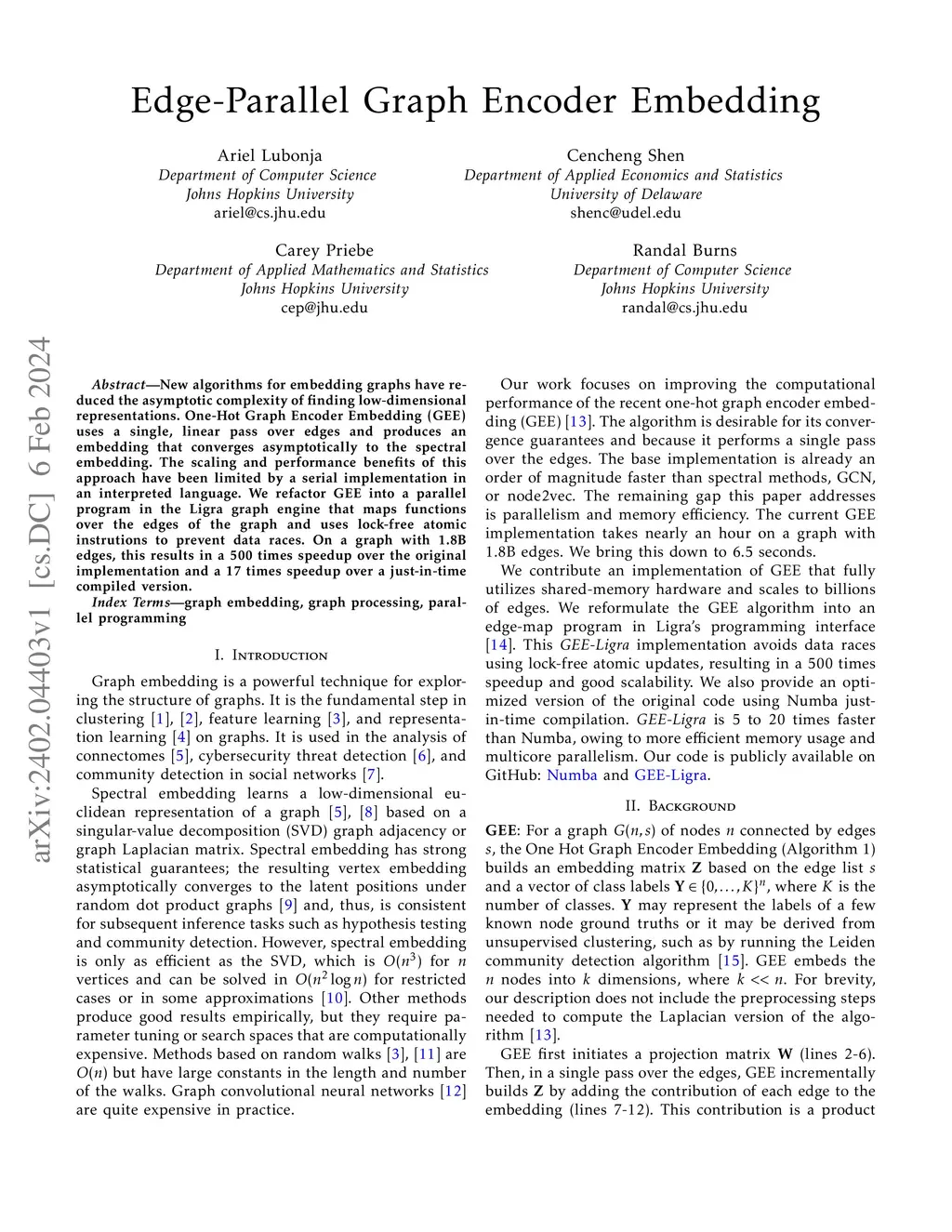 New algorithms for embedding graphs have reduced the asymptotic complexity of finding low-dimensional representations. One-Hot Graph Encoder Embedding (GEE) uses a single, linear pass over edges and produces an embedding that converges asymptotically to the spectral embedding. The scaling and performance benefits of this approach have been limited by a serial implementation in an interpreted language. We refactor GEE into a parallel program in the Ligra graph engine that maps functions over the edges of the graph and uses lock-free atomic instrutions to prevent data races. On a graph with 1.8B edges, this results in a 500 times speedup over the original implementation and a 17 times speedup over a just-in-time compiled version.