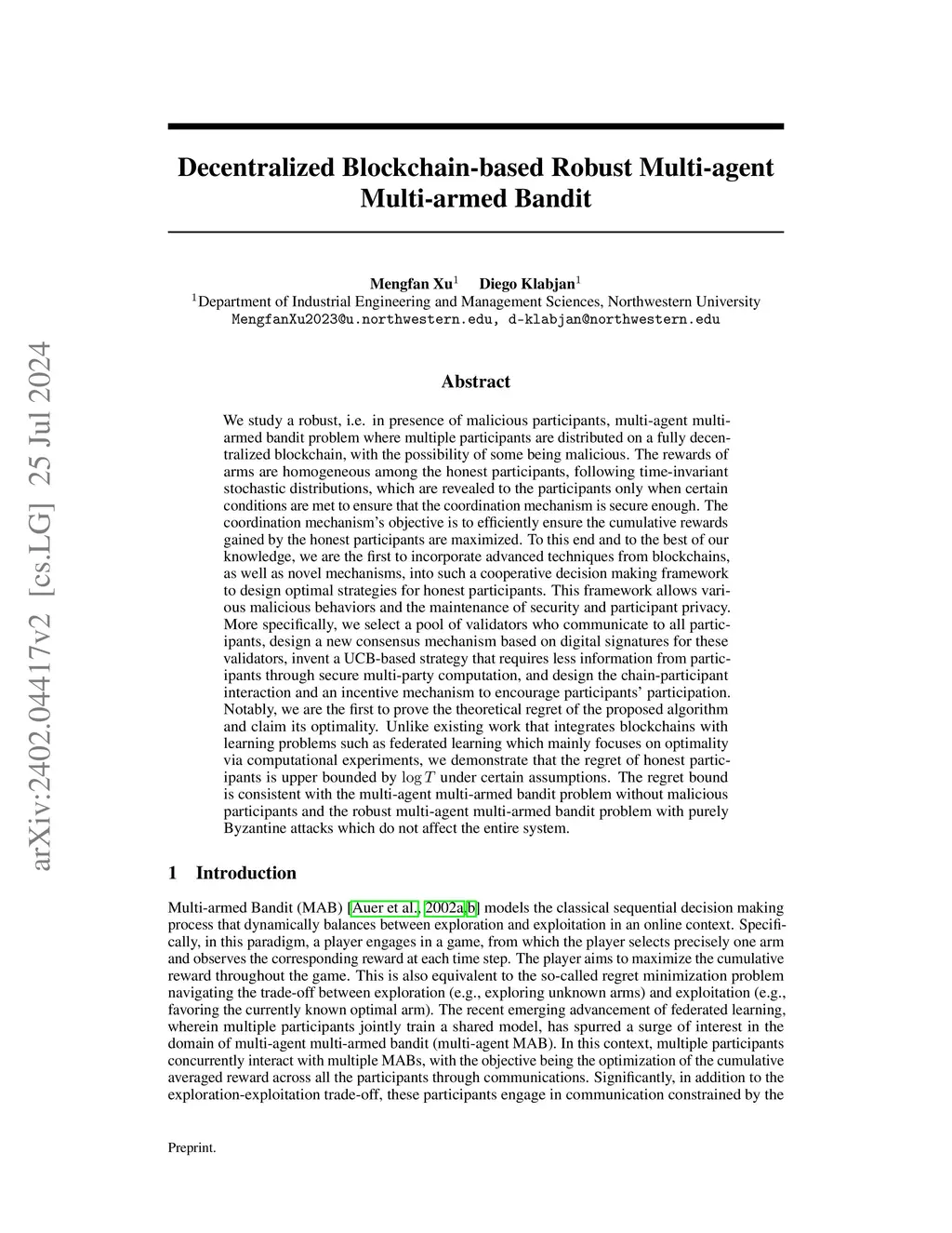 We study a robust multi-agent multi-armed bandit problem where multiple clients or participants are distributed on a fully decentralized blockchain, with the possibility of some being malicious. The rewards of arms are homogeneous among the clients, following time-invariant stochastic distributions that are revealed to the participants only when the system is secure enough. The system's objective is to efficiently ensure the cumulative rewards gained by the honest participants. To this end and to the best of our knowledge, we are the first to incorporate advanced techniques from blockchains, as well as novel mechanisms, into the system to design optimal strategies for honest participants. This allows various malicious behaviors and the maintenance of participant privacy. More specifically, we randomly select a pool of validators who have access to all participants, design a brand-new consensus mechanism based on digital signatures for these validators, invent a UCB-based strategy that requires less information from participants through secure multi-party computation, and design the chain-participant interaction and an incentive mechanism to encourage participants' participation. Notably, we are the first to prove the theoretical guarantee of the proposed algorithms by regret analyses in the context of optimality in blockchains. Unlike existing work that integrates blockchains with learning problems such as federated learning which mainly focuses on numerical optimality, we demonstrate that the regret of honest participants is upper bounded by . This is consistent with the multi-agent multi-armed bandit problem without malicious participants and the robust multi-agent multi-armed bandit problem with purely Byzantine attacks.