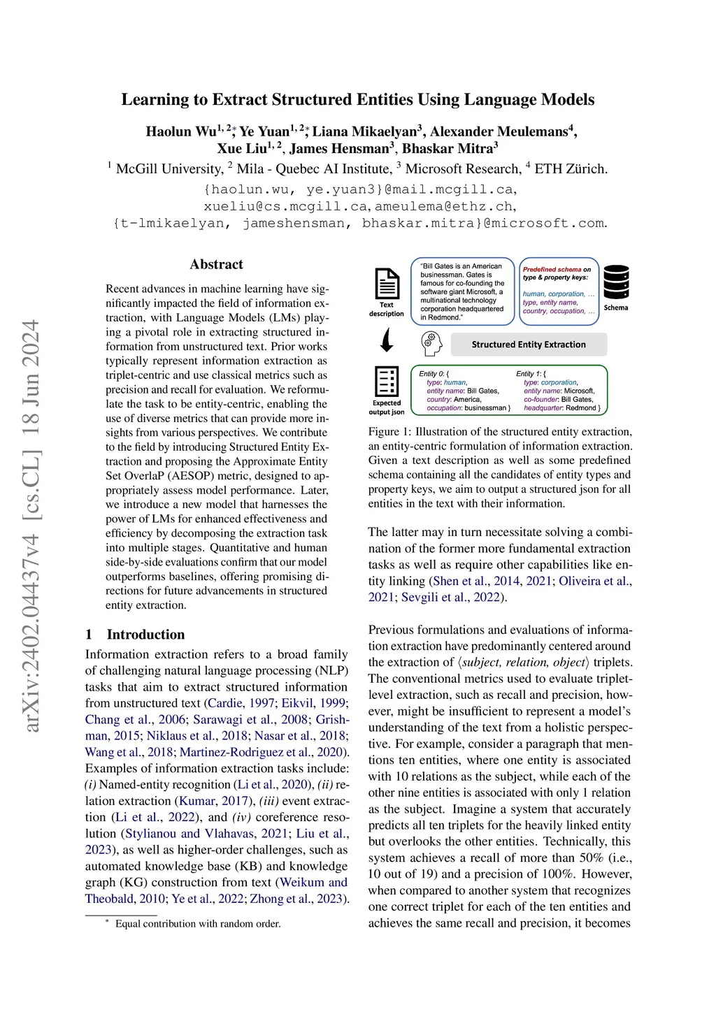 Recent advances in machine learning have significantly impacted the field of information extraction, with Language Models (LMs) playing a pivotal role in extracting structured information from unstructured text. Prior works typically represent information extraction as triplet-centric and use classical metrics such as precision and recall for evaluation. We reformulate the task to be entity-centric, enabling the use of diverse metrics that can provide more insights from various perspectives. We contribute to the field by introducing Structured Entity Extraction and proposing the Approximate Entity Set OverlaP (AESOP) metric, designed to appropriately assess model performance. Later, we introduce a new model that harnesses the power of LMs for enhanced effectiveness and efficiency by decomposing the extraction task into multiple stages. Quantitative and human side-by-side evaluations confirm that our model outperforms baselines, offering promising directions for future advancements in structured entity extraction.