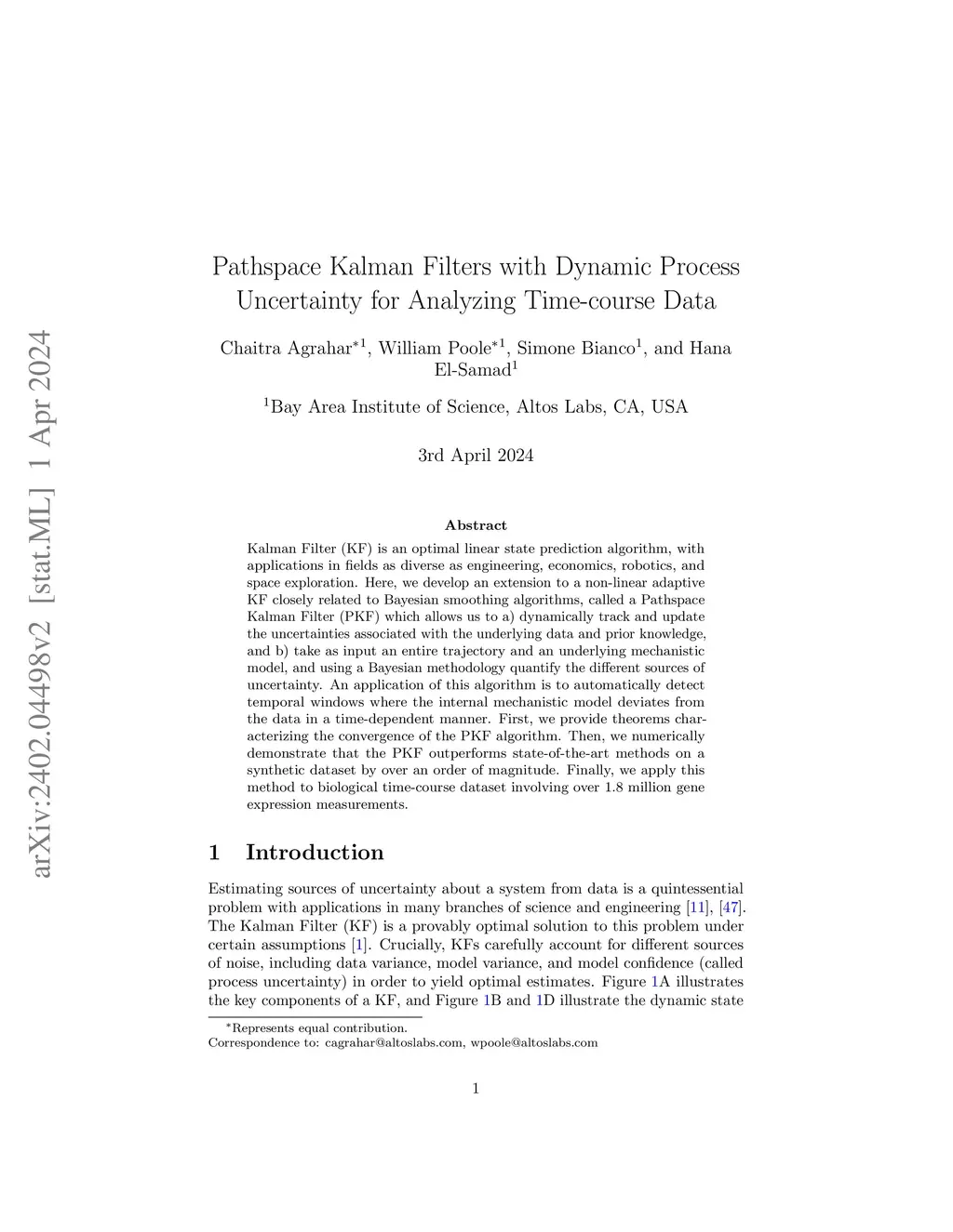 Kalman Filter (KF) is an optimal linear state prediction algorithm, with applications in fields as diverse as engineering, economics, robotics, and space exploration. Here, we develop an extension of the KF, called a Pathspace Kalman Filter (PKF) which allows us to a) dynamically track the uncertainties associated with the underlying data and prior knowledge, and b) take as input an entire trajectory and an underlying mechanistic model, and using a Bayesian methodology quantify the different sources of uncertainty. An application of this algorithm is to automatically detect temporal windows where the internal mechanistic model deviates from the data in a time-dependent manner. First, we provide theorems characterizing the convergence of the PKF algorithm. Then, we numerically demonstrate that the PKF outperforms conventional KF methods on a synthetic dataset lowering the mean-squared-error by several orders of magnitude. Finally, we apply this method to biological time-course dataset involving over 1.8 million gene expression measurements.