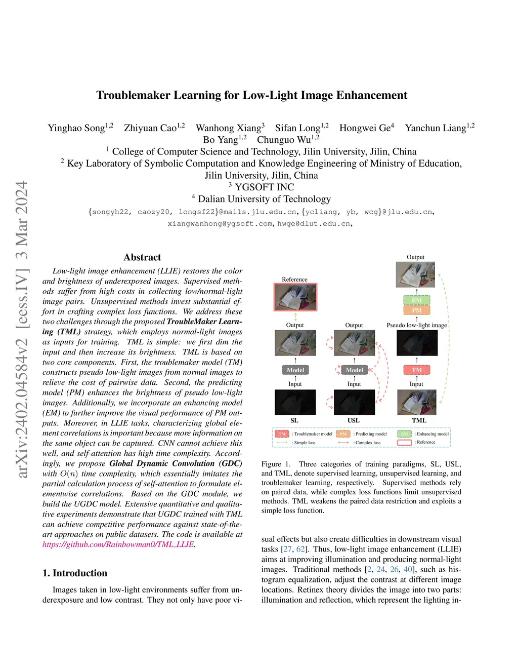 Low-light image enhancement (LLIE) restores the color and brightness of underexposed images. Supervised methods suffer from high costs in collecting low/normal-light image pairs. Unsupervised methods invest substantial effort in crafting complex loss functions. We address these two challenges through the proposed TroubleMaker Learning (TML) strategy, which employs normal-light images as inputs for training. TML is simple: we first dim the input and then increase its brightness. TML is based on two core components. First, the troublemaker model (TM) constructs pseudo low-light images from normal images to relieve the cost of pairwise data. Second, the predicting model (PM) enhances the brightness of pseudo low-light images. Additionally, we incorporate an enhancing model (EM) to further improve the visual performance of PM outputs. Moreover, in LLIE tasks, characterizing global element correlations is important because more information on the same object can be captured. CNN cannot achieve this well, and self-attention has high time complexity. Accordingly, we propose Global Dynamic Convolution (GDC) with O(n) time complexity, which essentially imitates the partial calculation process of self-attention to formulate elementwise correlations. Based on the GDC module, we build the UGDC model. Extensive quantitative and qualitative experiments demonstrate that UGDC trained with TML can achieve competitive performance against state-of-the-art approaches on public datasets. The code is available at https://github.com/Rainbowman0/TML_LLIE.