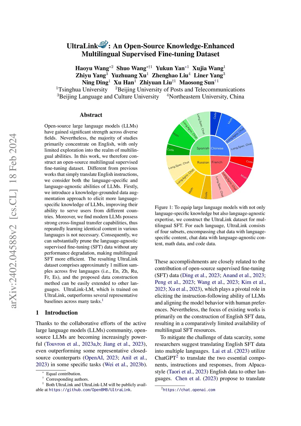 Open-source large language models (LLMs) have gained significant strength across diverse fields. Nevertheless, the majority of studies primarily concentrate on English, with only limited exploration into the realm of multilingual abilities. In this work, we therefore construct an open-source multilingual supervised fine-tuning dataset. Different from previous works that simply translate English instructions, we consider both the language-specific and language-agnostic abilities of LLMs. Firstly, we introduce a knowledge-grounded data augmentation approach to elicit more language-specific knowledge of LLMs, improving their ability to serve users from different countries. Moreover, we find modern LLMs possess strong cross-lingual transfer capabilities, thus repeatedly learning identical content in various languages is not necessary. Consequently, we can substantially prune the language-agnostic supervised fine-tuning (SFT) data without any performance degradation, making multilingual SFT more efficient. The resulting UltraLink dataset comprises approximately 1 million samples across five languages (i.e., En, Zh, Ru, Fr, Es), and the proposed data construction method can be easily extended to other languages. UltraLink-LM, which is trained on UltraLink, outperforms several representative baselines across many tasks.