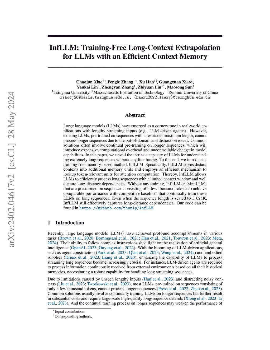 Large language models (LLMs) have emerged as a cornerstone in real-world applications with lengthy streaming inputs (e.g., LLM-driven agents). However, existing LLMs, pre-trained on sequences with a restricted maximum length, cannot process longer sequences due to the out-of-domain and distraction issues. Common solutions often involve continual pre-training on longer sequences, which will introduce expensive computational overhead and uncontrollable change in model capabilities. In this paper, we unveil the intrinsic capacity of LLMs for understanding extremely long sequences without any fine-tuning. To this end, we introduce a training-free memory-based method, InfLLM. Specifically, InfLLM stores distant contexts into additional memory units and employs an efficient mechanism to lookup token-relevant units for attention computation. Thereby, InfLLM allows LLMs to efficiently process long sequences with a limited context window and well capture long-distance dependencies. Without any training, InfLLM enables LLMs that are pre-trained on sequences consisting of a few thousand tokens to achieve comparable performance with competitive baselines that continually train these LLMs on long sequences. Even when the sequence length is scaled to K, InfLLM still effectively captures long-distance dependencies. Our code can be found in \url{https://github.com/thunlp/InfLLM}.