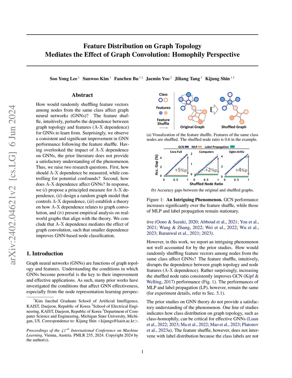 How would randomly shuffling feature vectors among nodes from the same class affect graph neural networks (GNNs)? The feature shuffle, intuitively, perturbs the dependence between graph topology and features (A-X dependence) for GNNs to learn from. Surprisingly, we observe a consistent and significant improvement in GNN performance following the feature shuffle. Having overlooked the impact of A-X dependence on GNNs, the prior literature does not provide a satisfactory understanding of the phenomenon. Thus, we raise two research questions. First, how should A-X dependence be measured, while controlling for potential confounds? Second, how does A-X dependence affect GNNs? In response, we (i) propose a principled measure for A-X dependence, (ii) design a random graph model that controls A-X dependence, (iii) establish a theory on how A-X dependence relates to graph convolution, and (iv) present empirical analysis on real-world graphs that align with the theory. We conclude that A-X dependence mediates the effect of graph convolution, such that smaller dependence improves GNN-based node classification.