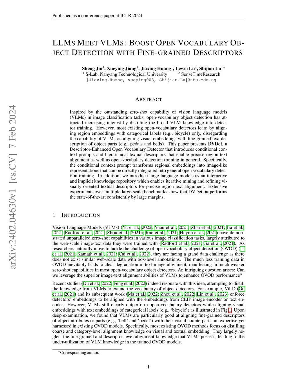 Inspired by the outstanding zero-shot capability of vision language models (VLMs) in image classification tasks, open-vocabulary object detection has attracted increasing interest by distilling the broad VLM knowledge into detector training. However, most existing open-vocabulary detectors learn by aligning region embeddings with categorical labels (e.g., bicycle) only, disregarding the capability of VLMs on aligning visual embeddings with fine-grained text description of object parts (e.g., pedals and bells). This paper presents DVDet, a Descriptor-Enhanced Open Vocabulary Detector that introduces conditional context prompts and hierarchical textual descriptors that enable precise region-text alignment as well as open-vocabulary detection training in general. Specifically, the conditional context prompt transforms regional embeddings into image-like representations that can be directly integrated into general open vocabulary detection training. In addition, we introduce large language models as an interactive and implicit knowledge repository which enables iterative mining and refining visually oriented textual descriptors for precise region-text alignment. Extensive experiments over multiple large-scale benchmarks show that DVDet outperforms the state-of-the-art consistently by large margins.