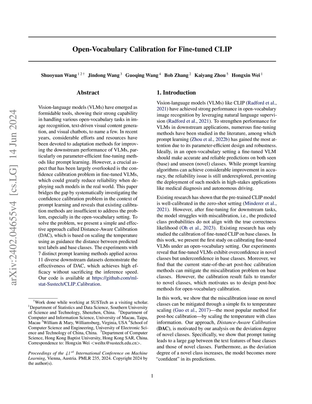 Vision-language models (VLMs) have emerged as formidable tools, showing their strong capability in handling various open-vocabulary tasks in image recognition, text-driven visual content generation, and visual chatbots, to name a few. In recent years, considerable efforts and resources have been devoted to adaptation methods for improving downstream performance of VLMs, particularly on parameter-efficient fine-tuning methods like prompt learning. However, a crucial aspect that has been largely overlooked is the confidence calibration problem in fine-tuned VLMs, which could greatly reduce reliability when deploying such models in the real world. This paper bridges the gap by systematically investigating the confidence calibration problem in the context of prompt learning and reveals that existing calibration methods are insufficient to address the problem, especially in the open-vocabulary setting. To solve the problem, we present a simple and effective approach called Distance-Aware Calibration (DAC), which is based on scaling the temperature using as guidance the distance between predicted text labels and base classes. The experiments with 7 distinct prompt learning methods applied across 11 diverse downstream datasets demonstrate the effectiveness of DAC, which achieves high efficacy without sacrificing the inference speed. Our code is available at https://github.com/ml-stat-Sustech/CLIP_Calibration.