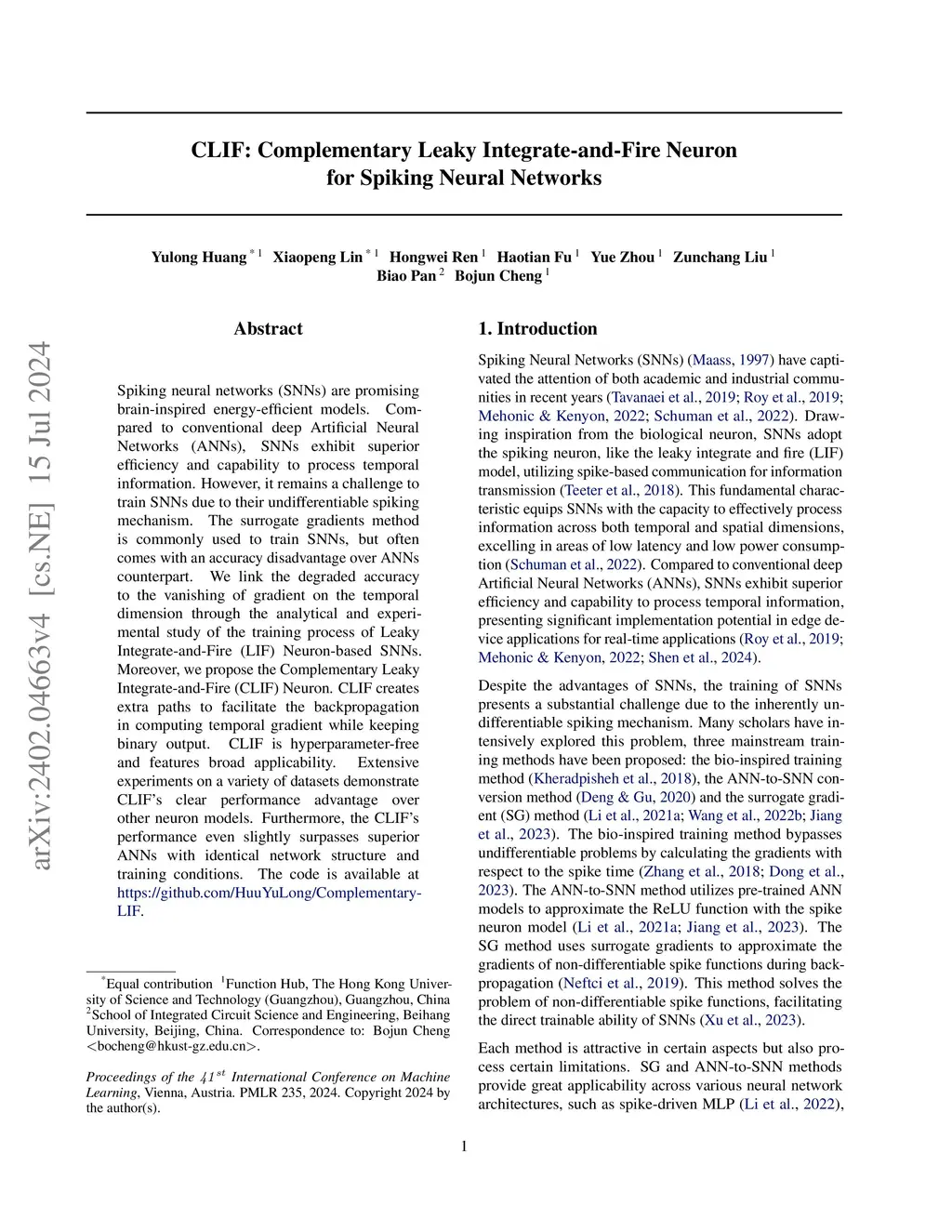 Spiking neural networks (SNNs) are promising brain-inspired energy-efficient models. Compared to conventional deep Artificial Neural Networks (ANNs), SNNs exhibit superior efficiency and capability to process temporal information. However, it remains a challenge to train SNNs due to their undifferentiable spiking mechanism. The surrogate gradients method is commonly used to train SNNs, but often comes with an accuracy disadvantage over ANNs counterpart. We link the degraded accuracy to the vanishing of gradient on the temporal dimension through the analytical and experimental study of the training process of Leaky Integrate-and-Fire (LIF) Neuron-based SNNs. Moreover, we propose the Complementary Leaky Integrate-and-Fire (CLIF) Neuron. CLIF creates extra paths to facilitate the backpropagation in computing temporal gradient while keeping binary output. CLIF is hyperparameter-free and features broad applicability. Extensive experiments on a variety of datasets demonstrate CLIF's clear performance advantage over other neuron models. Furthermore, the CLIF's performance even slightly surpasses superior ANNs with identical network structure and training conditions. The code is available atthis https URL.