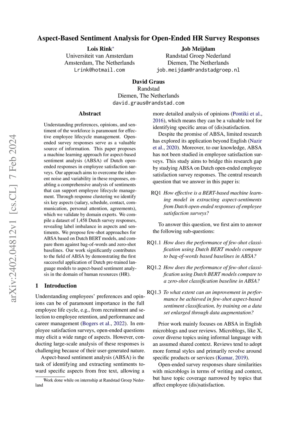 Understanding preferences, opinions, and sentiment of the workforce is paramount for effective employee lifecycle management. Open-ended survey responses serve as a valuable source of information. This paper proposes a machine learning approach for aspect-based sentiment analysis (ABSA) of Dutch open-ended responses in employee satisfaction surveys. Our approach aims to overcome the inherent noise and variability in these responses, enabling a comprehensive analysis of sentiments that can support employee lifecycle management. Through response clustering we identify six key aspects (salary, schedule, contact, communication, personal attention, agreements), which we validate by domain experts. We compile a dataset of 1,458 Dutch survey responses, revealing label imbalance in aspects and sentiments. We propose few-shot approaches for ABSA based on Dutch BERT models, and compare them against bag-of-words and zero-shot baselines. Our work significantly contributes to the field of ABSA by demonstrating the first successful application of Dutch pre-trained language models to aspect-based sentiment analysis in the domain of human resources (HR).