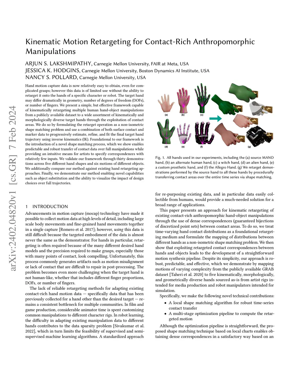 Hand motion capture data is now relatively easy to obtain, even for complicated grasps; however this data is of limited use without the ability to retarget it onto the hands of a specific character or robot. The target hand may differ dramatically in geometry, number of degrees of freedom (DOFs), or number of fingers. We present a simple, but effective framework capable of kinematically retargeting multiple human hand-object manipulations from a publicly available dataset to a wide assortment of kinematically and morphologically diverse target hands through the exploitation of contact areas. We do so by formulating the retarget operation as a non-isometric shape matching problem and use a combination of both surface contact and marker data to progressively estimate, refine, and fit the final target hand trajectory using inverse kinematics (IK). Foundational to our framework is the introduction of a novel shape matching process, which we show enables predictable and robust transfer of contact data over full manipulations while providing an intuitive means for artists to specify correspondences with relatively few inputs. We validate our framework through thirty demonstrations across five different hand shapes and six motions of different objects. We additionally compare our method against existing hand retargeting approaches. Finally, we demonstrate our method enabling novel capabilities such as object substitution and the ability to visualize the impact of design choices over full trajectories.