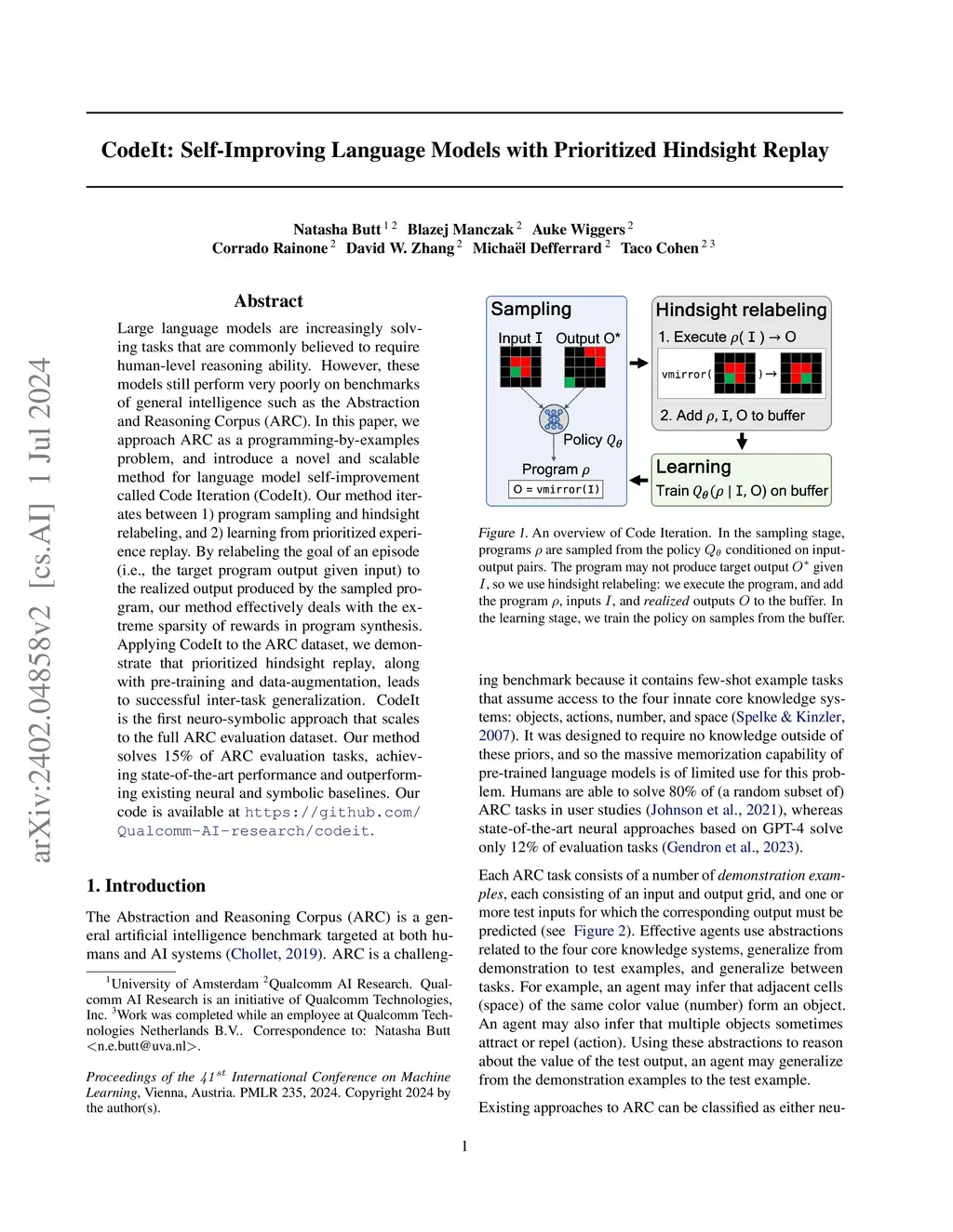 Large language models are increasingly solving tasks that are commonly believed to require human-level reasoning ability. However, these models still perform very poorly on benchmarks of general intelligence such as the Abstraction and Reasoning Corpus (ARC). In this paper, we approach ARC as a programming-by-examples problem, and introduce a novel and scalable method for language model self-improvement called Code Iteration (CodeIt). Our method iterates between 1) program sampling and hindsight relabeling, and 2) learning from prioritized experience replay. By relabeling the goal of an episode (i.e., the target program output given input) to the realized output produced by the sampled program, our method effectively deals with the extreme sparsity of rewards in program synthesis. Applying CodeIt to the ARC dataset, we demonstrate that prioritized hindsight replay, along with pre-training and data-augmentation, leads to successful inter-task generalization. CodeIt is the first neuro-symbolic approach that scales to the full ARC evaluation dataset. Our method solves 15% of ARC evaluation tasks, achieving state-of-the-art performance and outperforming existing neural and symbolic baselines. Our code is available at https://github.com/Qualcomm-AI-research/codeit .
