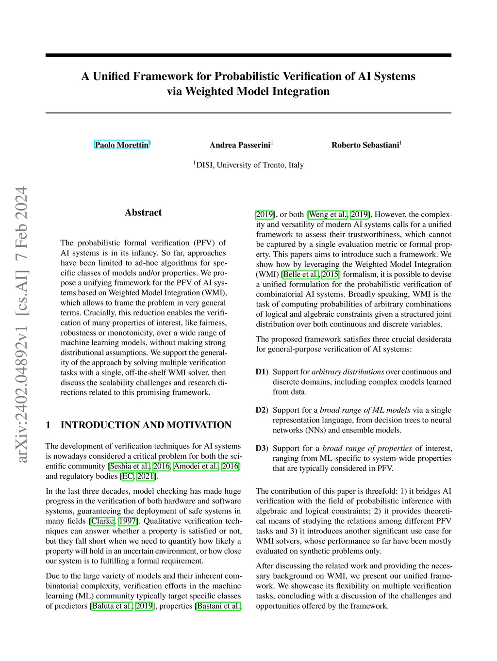 The probabilistic formal verification (PFV) of AI systems is in its infancy. So far, approaches have been limited to ad-hoc algorithms for specific classes of models and/or properties. We propose a unifying framework for the PFV of AI systems based onWeighted Model Integration (WMI), which allows to frame the problem in very general terms. Crucially, this reduction enables the verification of many properties of interest, like fairness, robustness or monotonicity, over a wide range of machine learning models, without making strong distributional assumptions. We support the generality of the approach by solving multiple verification tasks with a single, off-the-shelf WMI solver, then discuss the scalability challenges and research directions related to this promising framework.