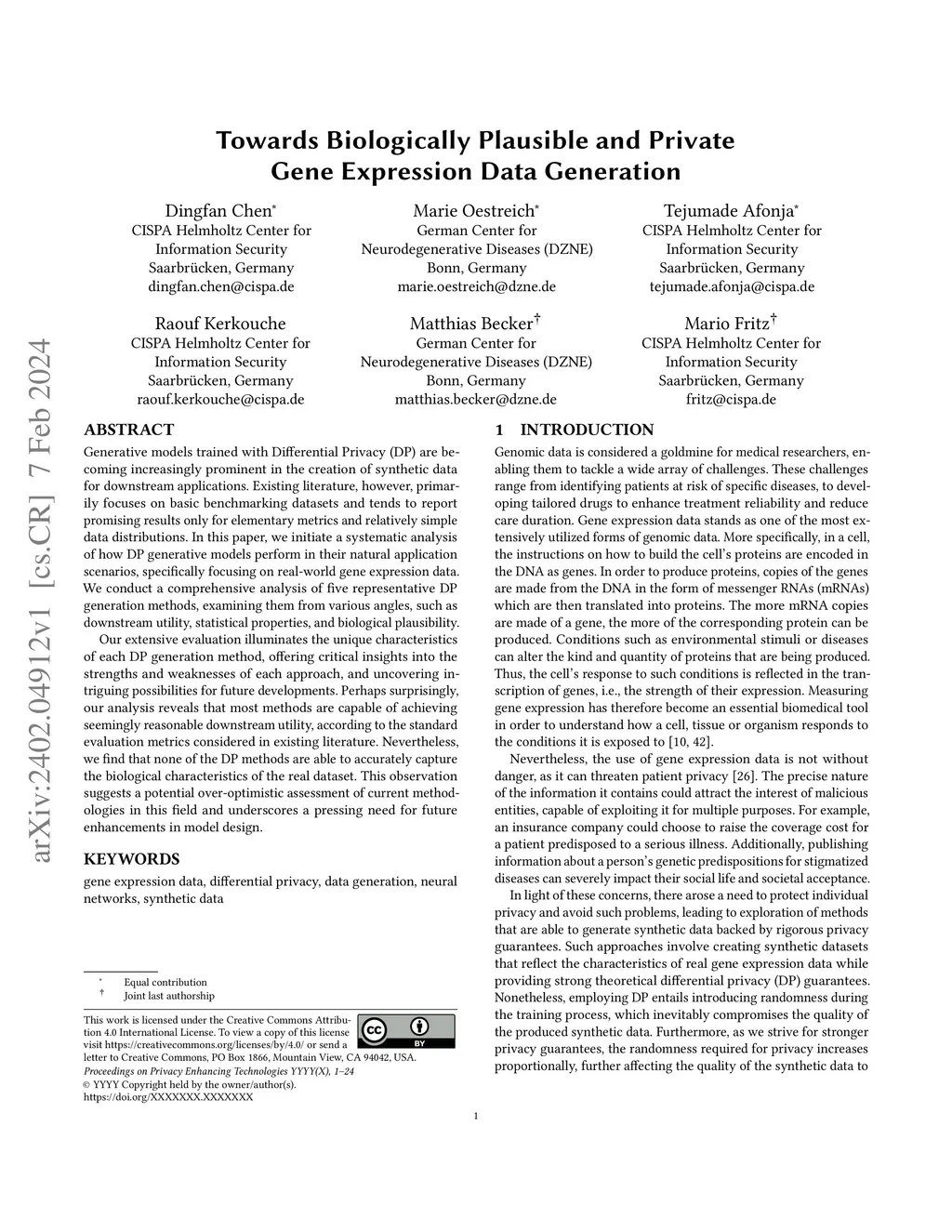 Towards Biologically Plausible and Private Gene Expression Data