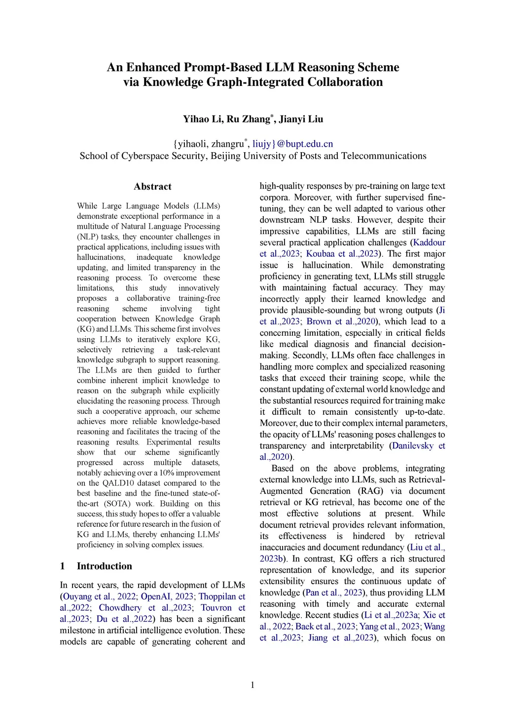 While Large Language Models (LLMs) demonstrate exceptional performance in a multitude of Natural Language Processing (NLP) tasks, they encounter challenges in practical applications, including issues with hallucinations, inadequate knowledge updating, and limited transparency in the reasoning process. To overcome these limitations, this study innovatively proposes a collaborative training-free reasoning scheme involving tight cooperation between Knowledge Graph (KG) and LLMs. This scheme first involves using LLMs to iteratively explore KG, selectively retrieving a task-relevant knowledge subgraph to support reasoning. The LLMs are then guided to further combine inherent implicit knowledge to reason on the subgraph while explicitly elucidating the reasoning process. Through such a cooperative approach, our scheme achieves more reliable knowledge-based reasoning and facilitates the tracing of the reasoning results. Experimental results show that our scheme significantly progressed across multiple datasets, notably achieving over a 10% improvement on the QALD10 dataset compared to the best baseline and the fine-tuned state-of-the-art (SOTA) work. Building on this success, this study hopes to offer a valuable reference for future research in the fusion of KG and LLMs, thereby enhancing LLMs' proficiency in solving complex issues.