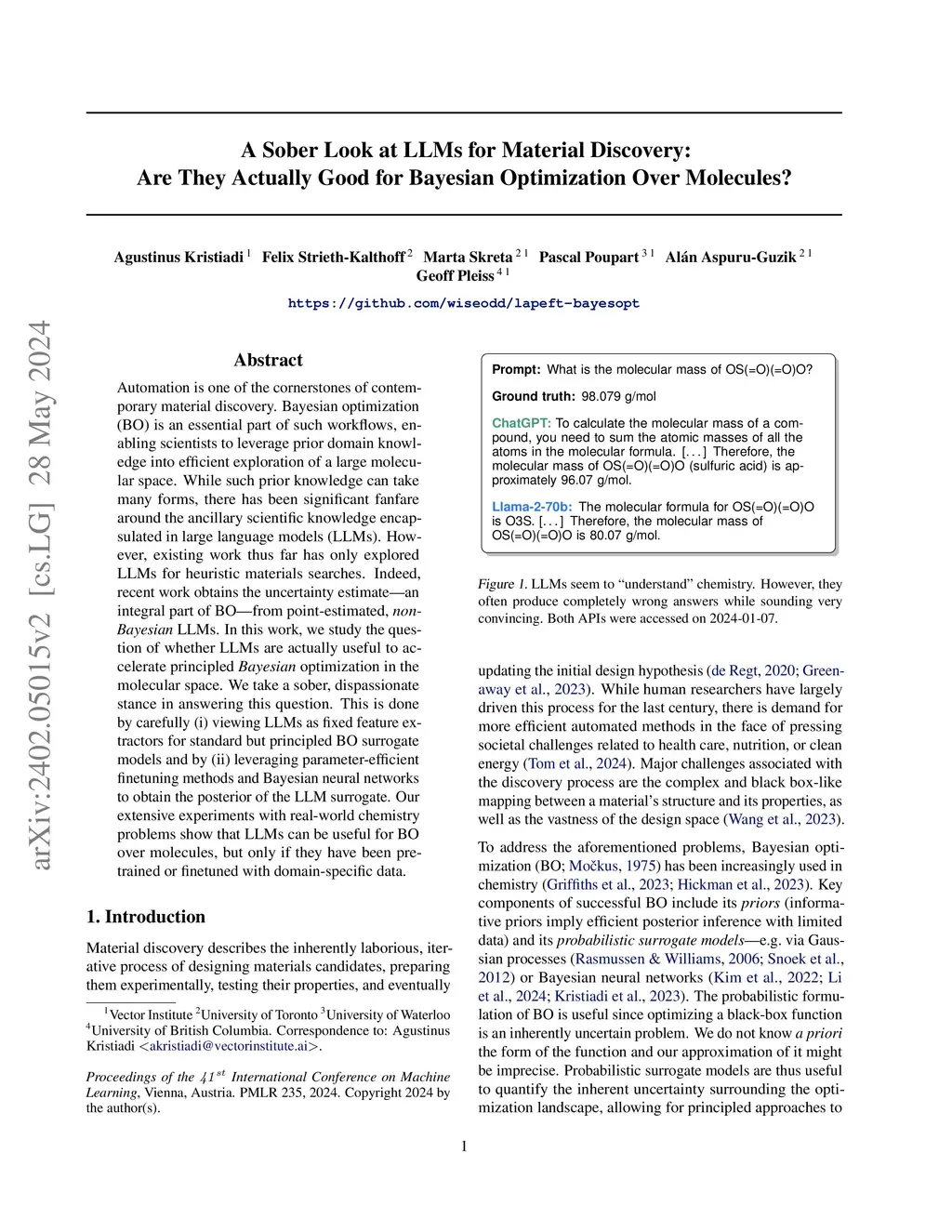 Automation is one of the cornerstones of contemporary material discovery. Bayesian optimization (BO) is an essential part of such workflows, enabling scientists to leverage prior domain knowledge into efficient exploration of a large molecular space. While such prior knowledge can take many forms, there has been significant fanfare around the ancillary scientific knowledge encapsulated in large language models (LLMs). However, existing work thus far has only explored LLMs for heuristic materials searches. Indeed, recent work obtains the uncertainty estimate -- an integral part of BO -- from point-estimated, non-Bayesian LLMs. In this work, we study the question of whether LLMs are actually useful to accelerate principled Bayesian optimization in the molecular space. We take a sober, dispassionate stance in answering this question. This is done by carefully (i) viewing LLMs as fixed feature extractors for standard but principled BO surrogate models and by (ii) leveraging parameter-efficient finetuning methods and Bayesian neural networks to obtain the posterior of the LLM surrogate. Our extensive experiments with real-world chemistry problems show that LLMs can be useful for BO over molecules, but only if they have been pretrained or finetuned with domain-specific data.