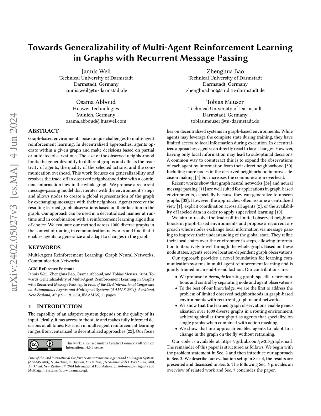 Graph-based environments pose unique challenges to multi-agent reinforcement learning. In decentralized approaches, agents operate within a given graph and make decisions based on partial or outdated observations. The size of the observed neighborhood limits the generalizability to different graphs and affects the reactivity of agents, the quality of the selected actions, and the communication overhead. This work focuses on generalizability and resolves the trade-off in observed neighborhood size with a continuous information flow in the whole graph. We propose a recurrent message-passing model that iterates with the environment's steps and allows nodes to create a global representation of the graph by exchanging messages with their neighbors. Agents receive the resulting learned graph observations based on their location in the graph. Our approach can be used in a decentralized manner at runtime and in combination with a reinforcement learning algorithm of choice. We evaluate our method across 1000 diverse graphs in the context of routing in communication networks and find that it enables agents to generalize and adapt to changes in the graph.