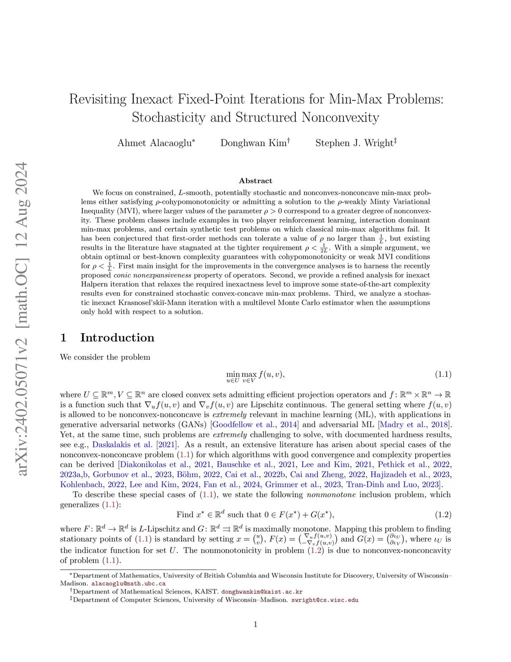 We focus on constrained, -smooth, nonconvex-nonconcave min-max problems either satisfying -cohypomonotonicity or admitting a solution to the -weakly Minty Variational Inequality (MVI), where larger values of the parameter correspond to a greater degree of nonconvexity. These problem classes include examples in two player reinforcement learning, interaction dominant min-max problems, and certain synthetic test problems on which classical min-max algorithms fail. It has been conjectured that first-order methods can tolerate value of no larger than , but existing results in the literature have stagnated at the tighter requirement . With a simple argument, we obtain optimal or best-known complexity guarantees with cohypomonotonicity or weak MVI conditions for . The algorithms we analyze are inexact variants of Halpern and Krasnosel'ski\u{\i}-Mann (KM) iterations. We also provide algorithms and complexity guarantees in the stochastic case with the same range on . Our main insight for the improvements in the convergence analyses is to harness the recently proposed "conic nonexpansiveness" property of operators. As byproducts, we provide a refined analysis for inexact Halpern iteration and propose a stochastic KM iteration with a multilevel Monte Carlo estimator.