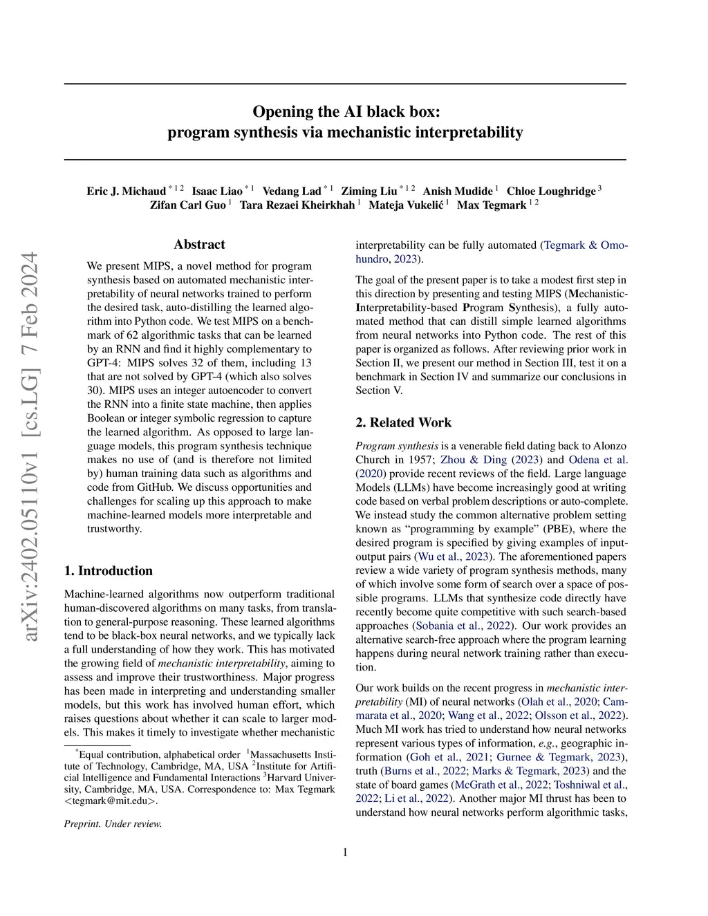 We present MIPS, a novel method for program synthesis based on automated mechanistic interpretability of neural networks trained to perform the desired task, auto-distilling the learned algorithm into Python code. We test MIPS on a benchmark of 62 algorithmic tasks that can be learned by an RNN and find it highly complementary to GPT-4: MIPS solves 32 of them, including 13 that are not solved by GPT-4 (which also solves 30). MIPS uses an integer autoencoder to convert the RNN into a finite state machine, then applies Boolean or integer symbolic regression to capture the learned algorithm. As opposed to large language models, this program synthesis technique makes no use of (and is therefore not limited by) human training data such as algorithms and code from GitHub. We discuss opportunities and challenges for scaling up this approach to make machine-learned models more interpretable and trustworthy.