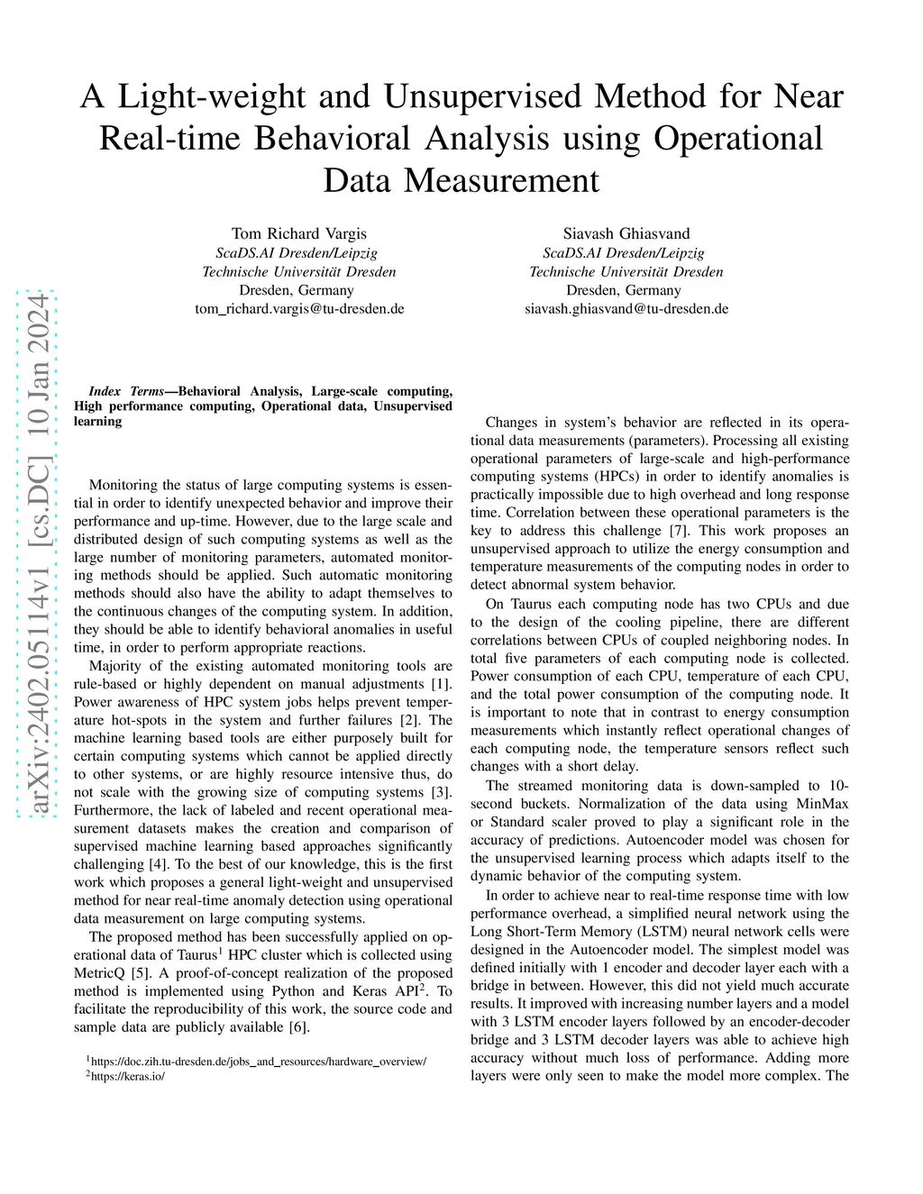 Monitoring the status of large computing systems is essential to identify unexpected behavior and improve their performance and uptime. However, due to the large-scale and distributed design of such computing systems as well as a large number of monitoring parameters, automated monitoring methods should be applied. Such automatic monitoring methods should also have the ability to adapt themselves to the continuous changes in the computing system. In addition, they should be able to identify behavioral anomalies in useful time, to perform appropriate reactions. This work proposes a general lightweight and unsupervised method for near real-time anomaly detection using operational data measurement on large computing systems. The proposed model requires as little as 4 hours of data and 50 epochs for each training process to accurately resemble the behavioral pattern of computing systems.
