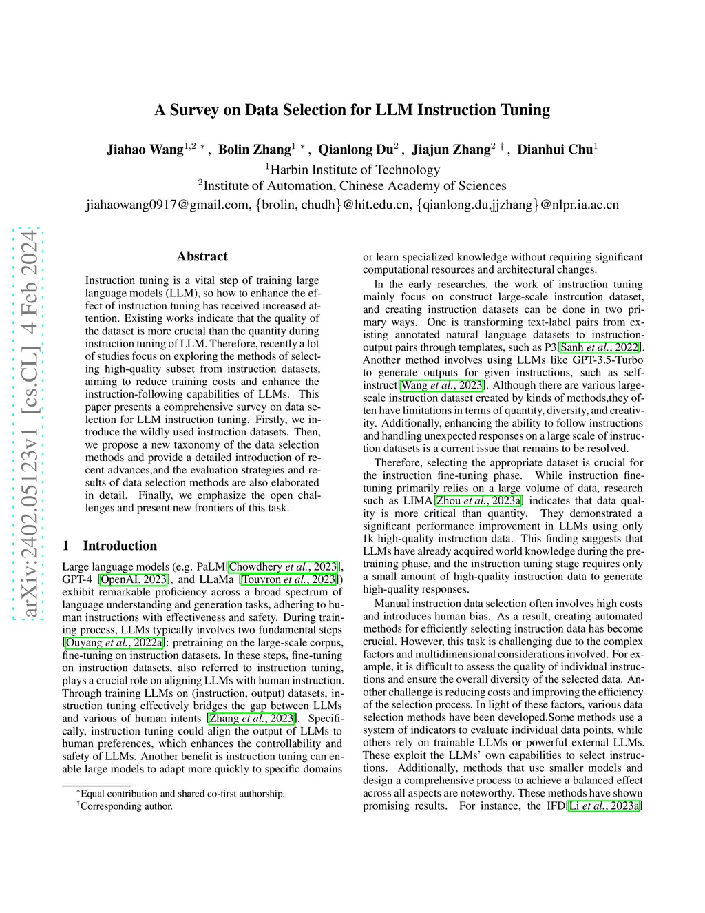 Instruction tuning is a vital step of training large language models (LLMs), so how to enhance the effect of instruction tuning has received increased attention. Existing works indicate that the quality of the dataset is more crucial than the quantity during instruction tuning of LLMs. Therefore, recently a lot of studies focus on exploring the methods of selecting high-quality subset from instruction datasets, aiming to reduce training costs and enhance the instruction-following capabilities of LLMs. This paper presents a comprehensive survey on data selection for LLM instruction tuning. Firstly, we introduce the wildly used instruction datasets. Then, we propose a new taxonomy of the data selection methods and provide a detailed introduction of recent advances, and the evaluation strategies and results of data selection methods are also elaborated in detail. Finally, we emphasize the open challenges and present new frontiers of this task.