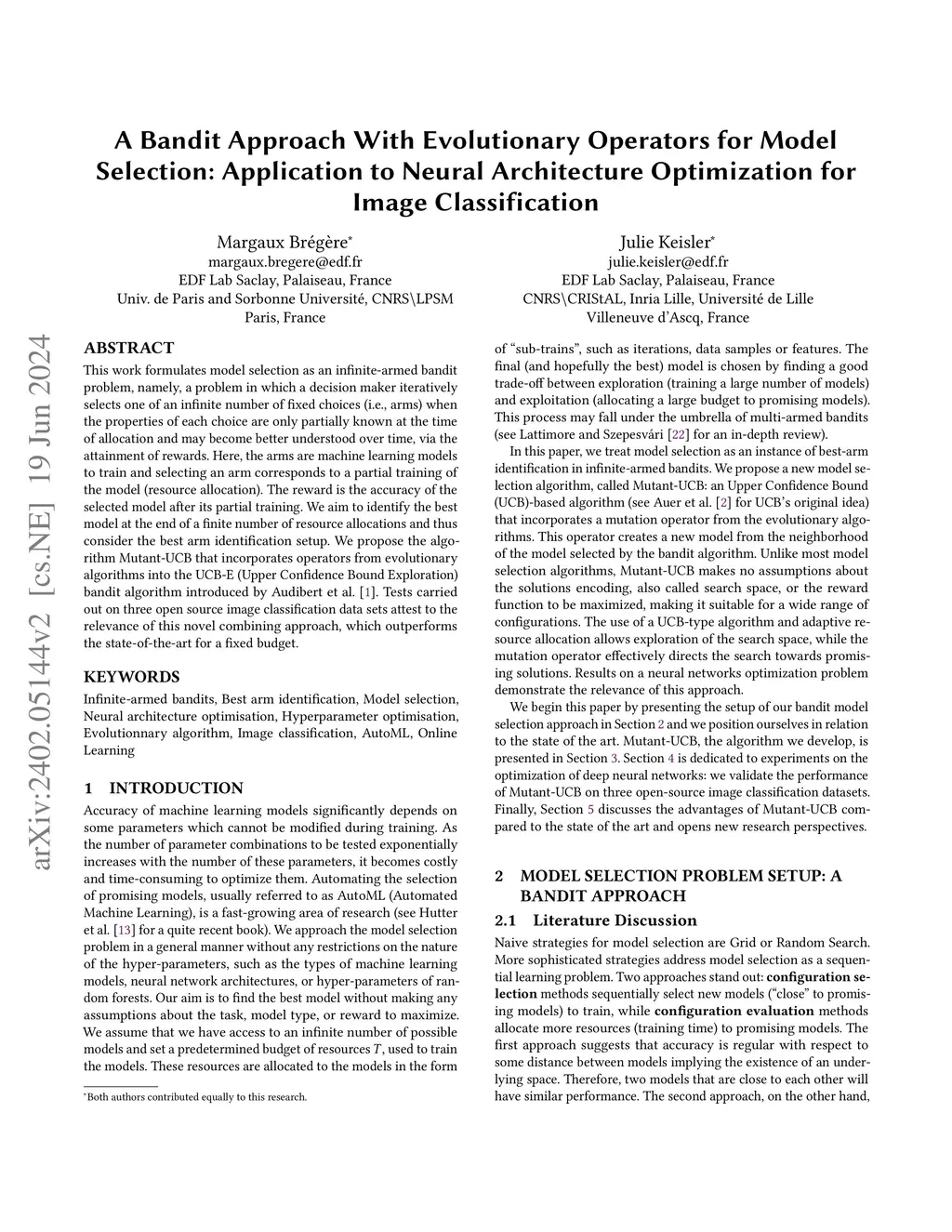 A Bandit Approach with Evolutionary Operators for Model Selection