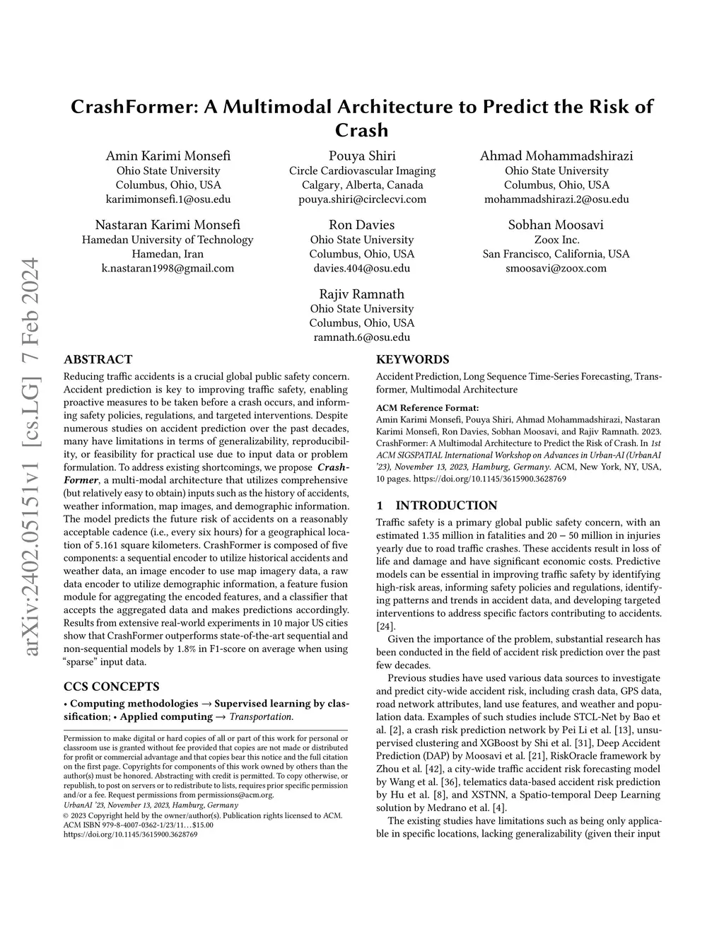 Reducing traffic accidents is a crucial global public safety concern. Accident prediction is key to improving traffic safety, enabling proactive measures to be taken before a crash occurs, and informing safety policies, regulations, and targeted interventions. Despite numerous studies on accident prediction over the past decades, many have limitations in terms of generalizability, reproducibility, or feasibility for practical use due to input data or problem formulation. To address existing shortcomings, we propose CrashFormer, a multi-modal architecture that utilizes comprehensive (but relatively easy to obtain) inputs such as the history of accidents, weather information, map images, and demographic information. The model predicts the future risk of accidents on a reasonably acceptable cadence (i.e., every six hours) for a geographical location of 5.161 square kilometers. CrashFormer is composed of five components: a sequential encoder to utilize historical accidents and weather data, an image encoder to use map imagery data, a raw data encoder to utilize demographic information, a feature fusion module for aggregating the encoded features, and a classifier that accepts the aggregated data and makes predictions accordingly. Results from extensive real-world experiments in 10 major US cities show that CrashFormer outperforms state-of-the-art sequential and non-sequential models by 1.8% in F1-score on average when using ``sparse'' input data.