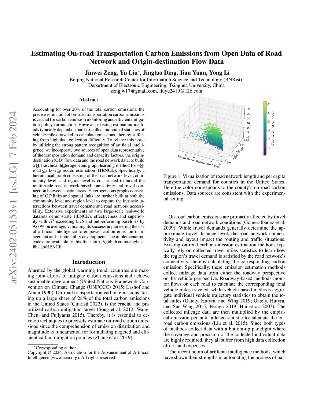 Accounting for over 20% of the total carbon emissions, the precise estimation of on-road transportation carbon emissions is crucial for carbon emission monitoring and efficient mitigation policy formulation. However, existing estimation methods typically depend on hard-to-collect individual statistics of vehicle miles traveled to calculate emissions, thereby suffering from high data collection difficulty. To relieve this issue by utilizing the strong pattern recognition of artificial intelligence, we incorporate two sources of open data representative of the transportation demand and capacity factors, the origin-destination (OD) flow data and the road network data, to build a hierarchical heterogeneous graph learning method for on-road carbon emission estimation (HENCE). Specifically, a hierarchical graph consisting of the road network level, community level, and region level is constructed to model the multi-scale road network-based connectivity and travel connection between spatial areas. Heterogeneous graphs consisting of OD links and spatial links are further built at both the community level and region level to capture the intrinsic interactions between travel demand and road network accessibility. Extensive experiments on two large-scale real-world datasets demonstrate HENCE's effectiveness and superiority with R-squared exceeding 0.75 and outperforming baselines by 9.60% on average, validating its success in pioneering the use of artificial intelligence to empower carbon emission management and sustainability development. The implementation codes are available at this link: https://github.com/tsinghua-fib-lab/HENCE.