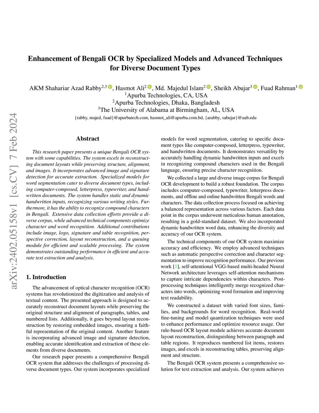 This research paper presents a unique Bengali OCR system with some capabilities. The system excels in reconstructing document layouts while preserving structure, alignment, and images. It incorporates advanced image and signature detection for accurate extraction. Specialized models for word segmentation cater to diverse document types, including computer-composed, letterpress, typewriter, and handwritten documents. The system handles static and dynamic handwritten inputs, recognizing various writing styles. Furthermore, it has the ability to recognize compound characters in Bengali. Extensive data collection efforts provide a diverse corpus, while advanced technical components optimize character and word recognition. Additional contributions include image, logo, signature and table recognition, perspective correction, layout reconstruction, and a queuing module for efficient and scalable processing. The system demonstrates outstanding performance in efficient and accurate text extraction and analysis.