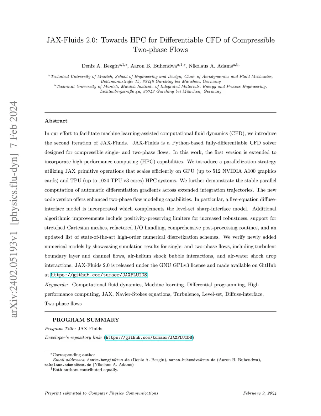 In our effort to facilitate machine learning-assisted computational fluid dynamics (CFD), we introduce the second iteration of JAX-Fluids. JAX-Fluids is a Python-based fully-differentiable CFD solver designed for compressible single- and two-phase flows. In this work, the first version is extended to incorporate high-performance computing (HPC) capabilities. We introduce a parallelization strategy utilizing JAX primitive operations that scales efficiently on GPU (up to 512 NVIDIA A100 graphics cards) and TPU (up to 1024 TPU v3 cores) HPC systems. We further demonstrate the stable parallel computation of automatic differentiation gradients across extended integration trajectories. The new code version offers enhanced two-phase flow modeling capabilities. In particular, a five-equation diffuse-interface model is incorporated which complements the level-set sharp-interface model. Additional algorithmic improvements include positivity-preserving limiters for increased robustness, support for stretched Cartesian meshes, refactored I/O handling, comprehensive post-processing routines, and an updated list of state-of-the-art high-order numerical discretization schemes. We verify newly added numerical models by showcasing simulation results for single- and two-phase flows, including turbulent boundary layer and channel flows, air-helium shock bubble interactions, and air-water shock drop interactions.
