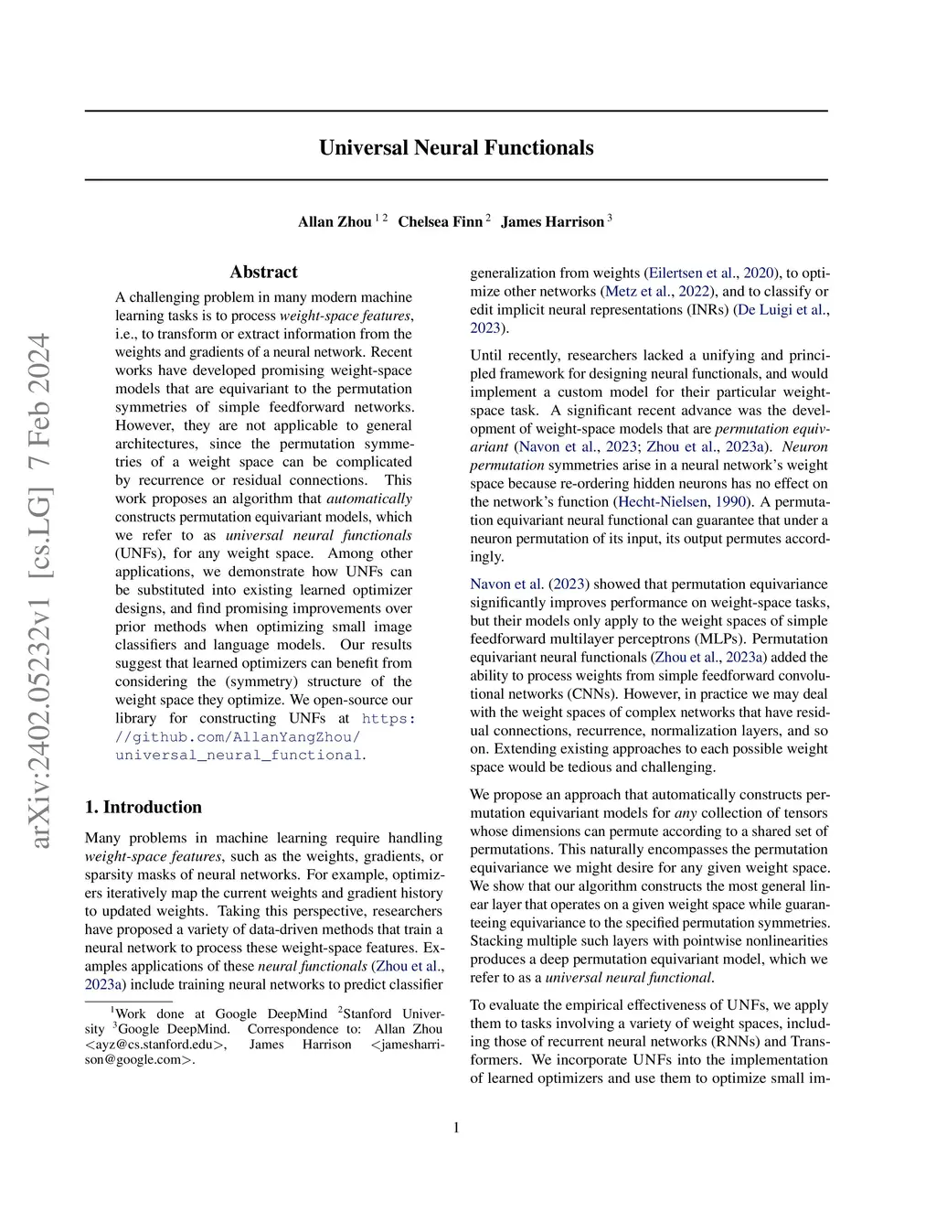 A challenging problem in many modern machine learning tasks is to process weight-space features, i.e., to transform or extract information from the weights and gradients of a neural network. Recent works have developed promising weight-space models that are equivariant to the permutation symmetries of simple feedforward networks. However, they are not applicable to general architectures, since the permutation symmetries of a weight space can be complicated by recurrence or residual connections. This work proposes an algorithm that automatically constructs permutation equivariant models, which we refer to as universal neural functionals (UNFs), for any weight space. Among other applications, we demonstrate how UNFs can be substituted into existing learned optimizer designs, and find promising improvements over prior methods when optimizing small image classifiers and language models. Our results suggest that learned optimizers can benefit from considering the (symmetry) structure of the weight space they optimize. We open-source our library for constructing UNFs at https://github.com/AllanYangZhou/universal_neural_functional.